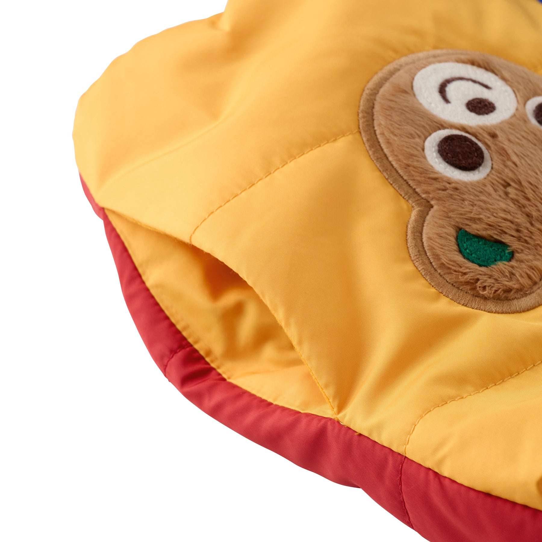 Pucca's face is made of soft fleece material, creating a three-dimensional effect.