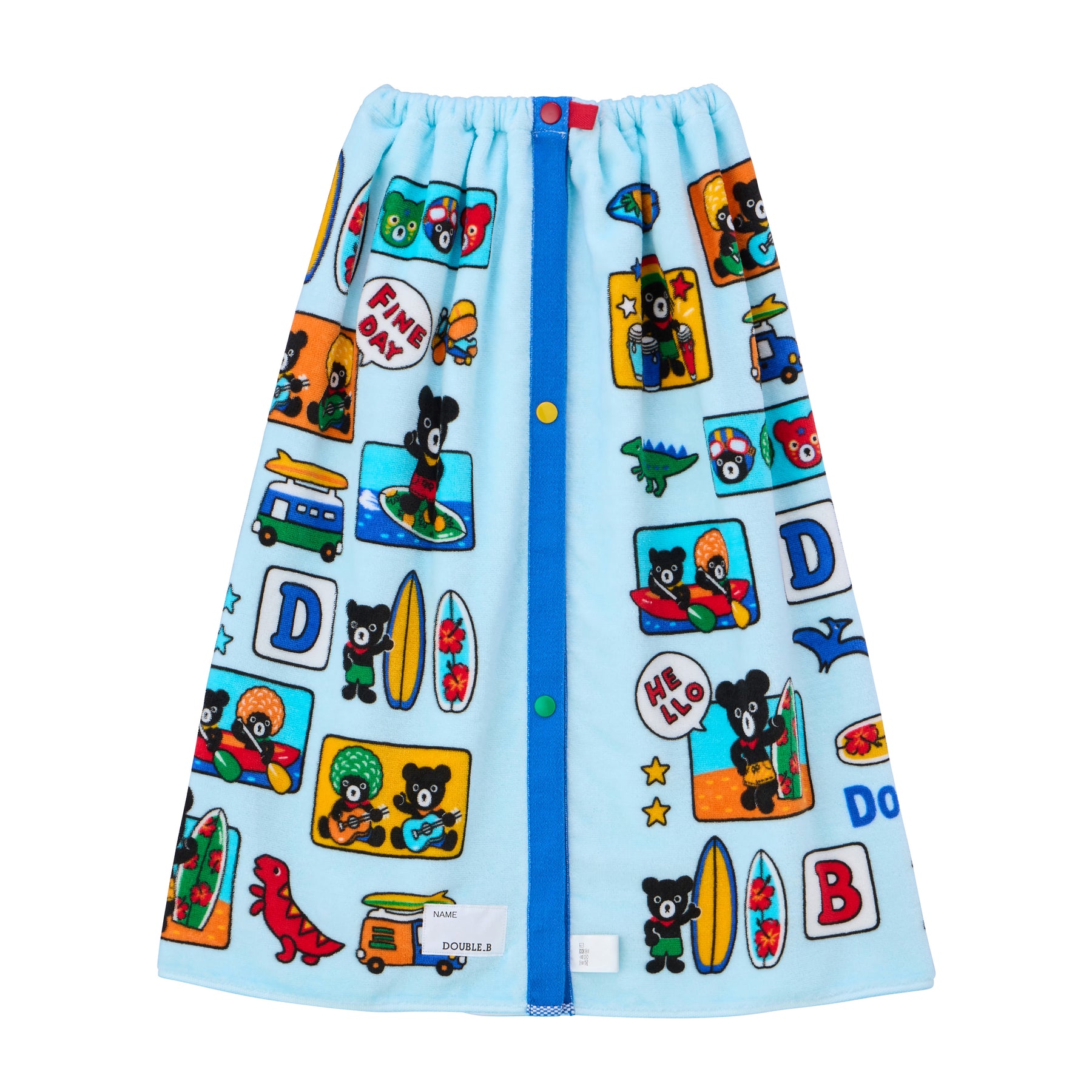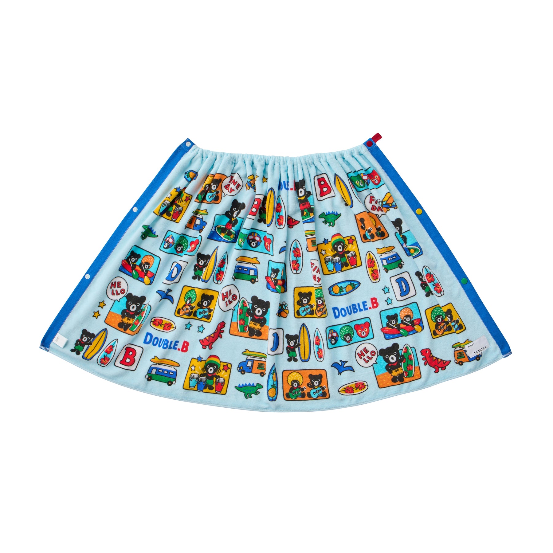 This is a snap-fastened beach towel with a colorful, pop, and funky design. A convenient item for trips to the pool or beach, or for after a bath. It’s also recommended to coordinate it as a series with the matching amphibious shorts in the same pattern.