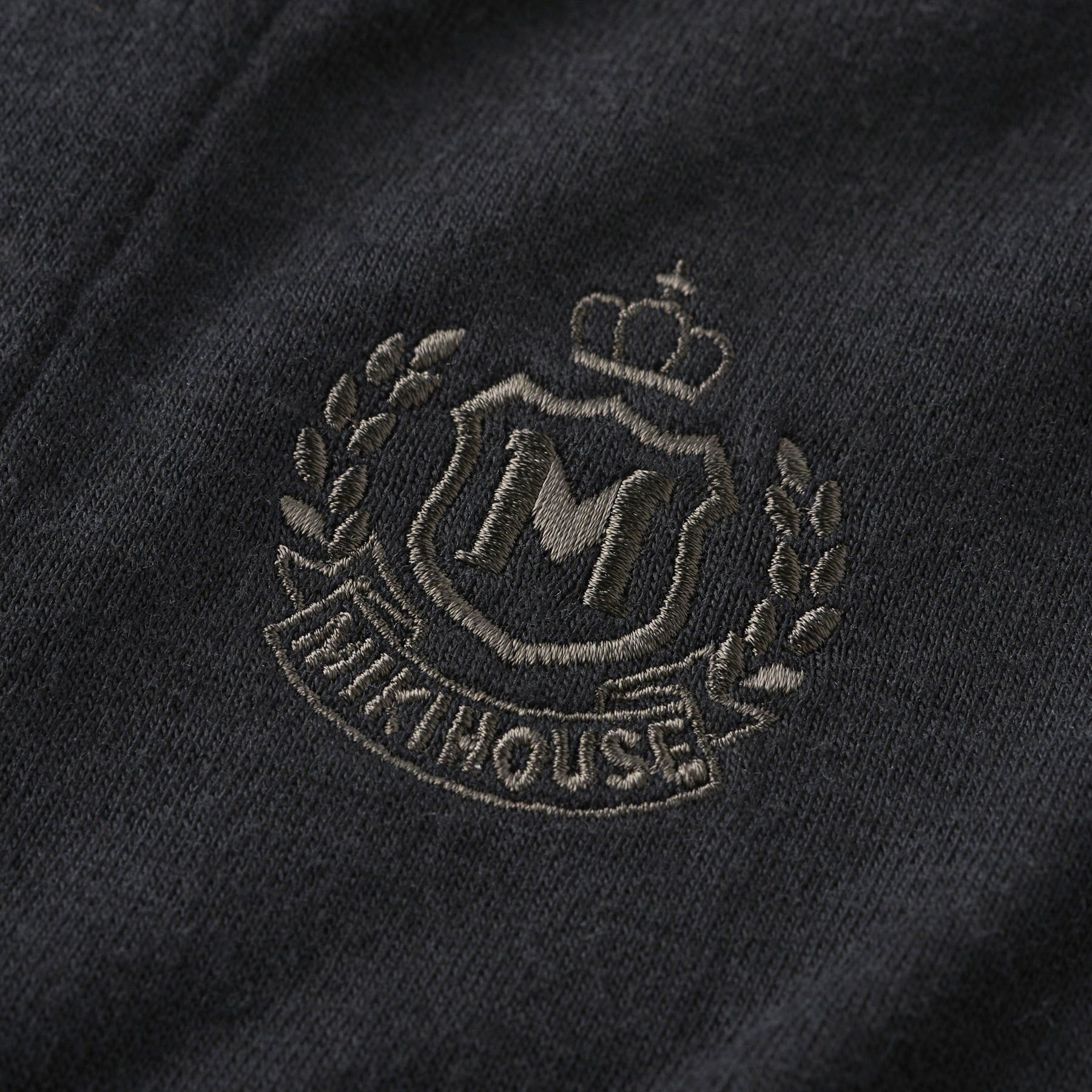 A monogram embroidery featuring the letter “M” is placed on the chest.
