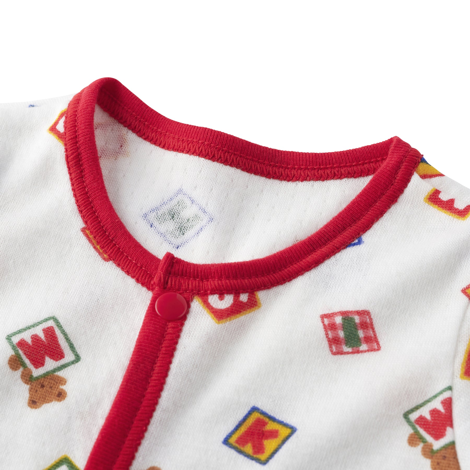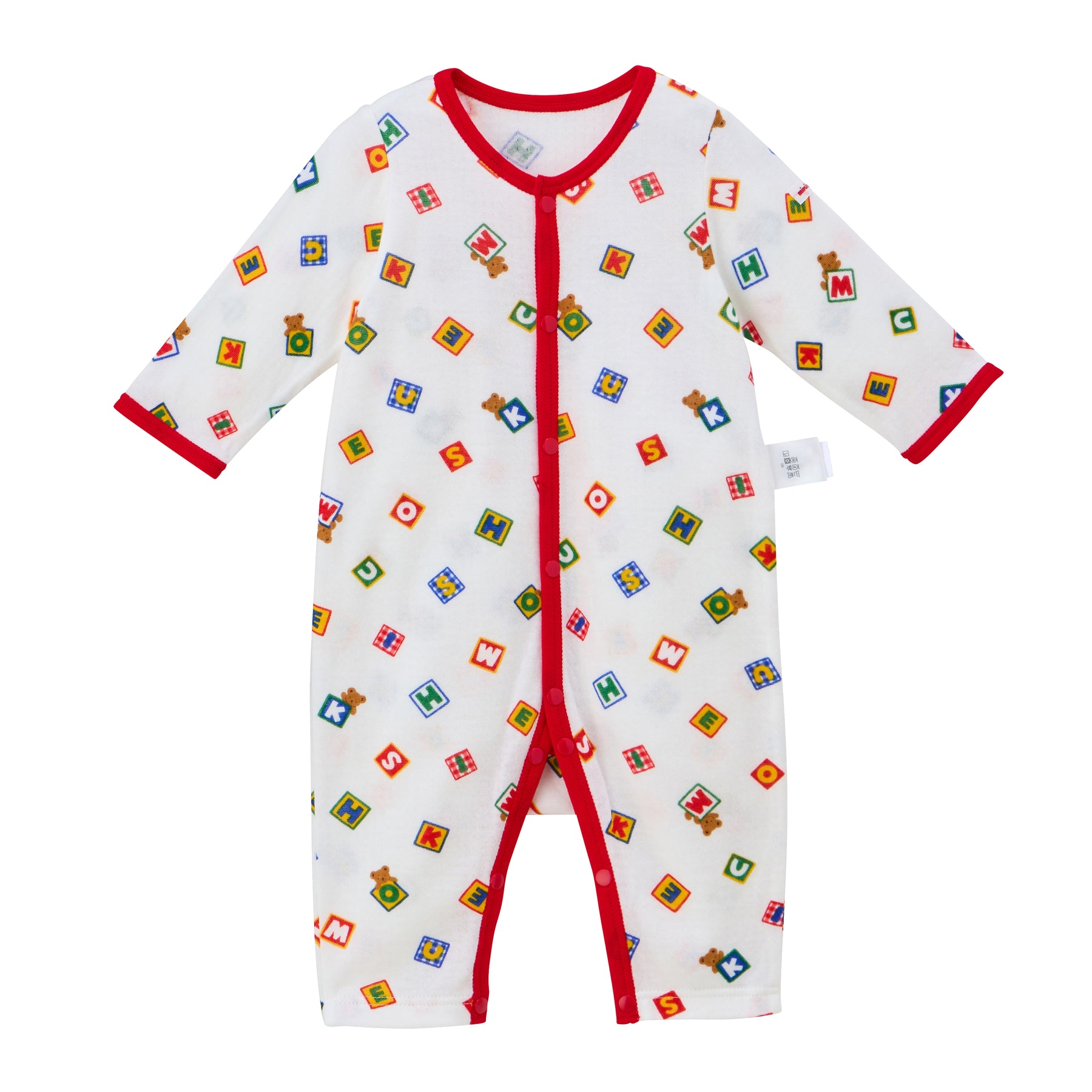 This coverall underwear is made of a softly layered double-knit gauze material. It features a multi-dot and block logo print pattern. We have newly added a 90 cm size that can also accommodate larger sizes.