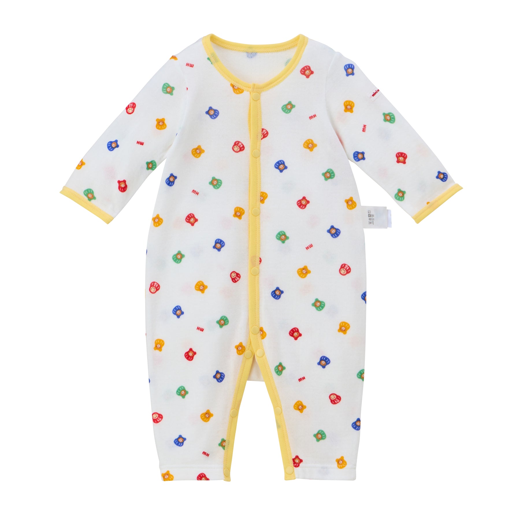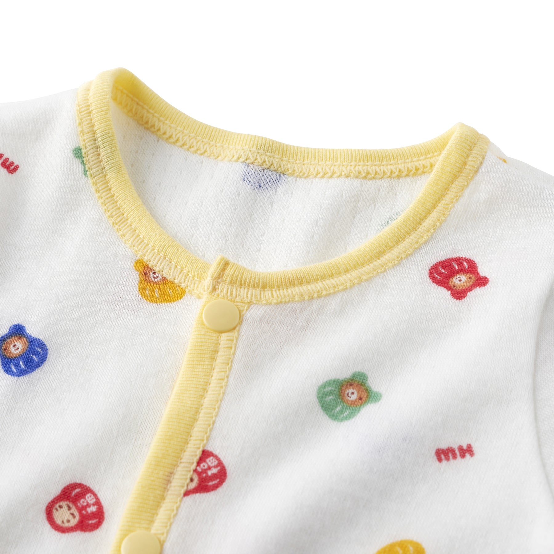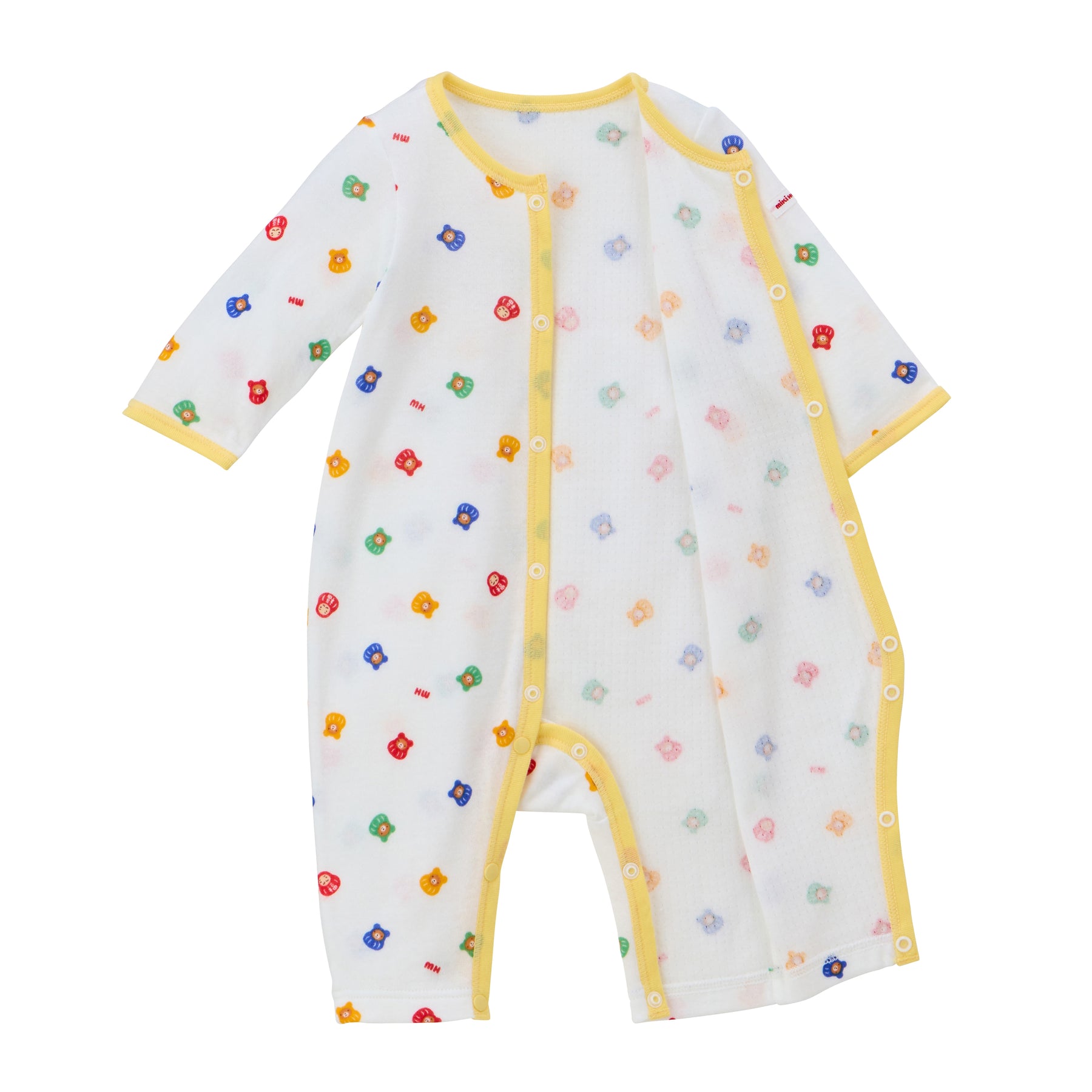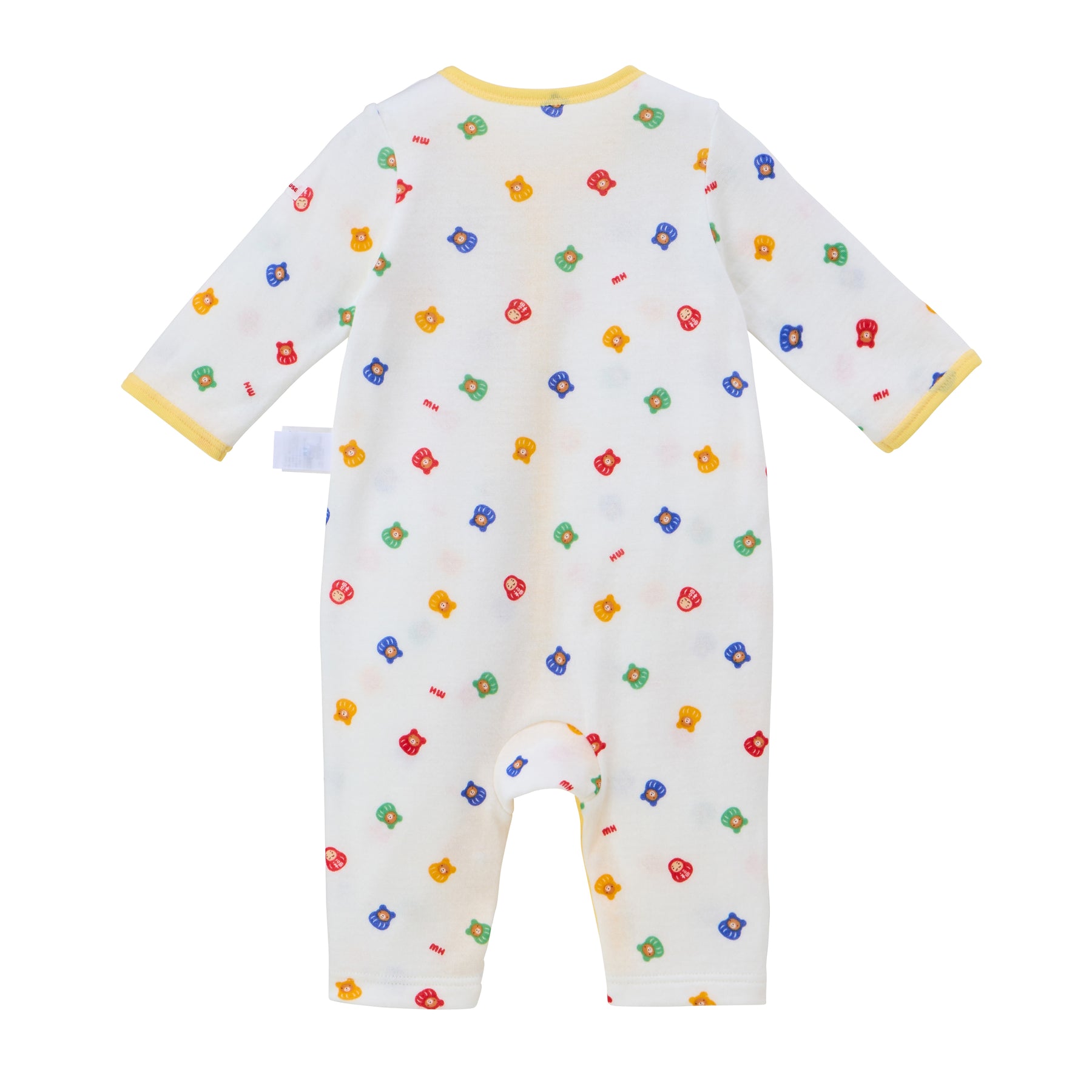 This coverall underwear is made of a softly layered double-knit gauze material. It features a printed pattern of beckoning cats and lucky daruma dolls. These auspicious, distinctly Japanese motifs make it a great choice for baby gifts and presents. We have newly added a 90 cm size that can also accommodate larger sizes.