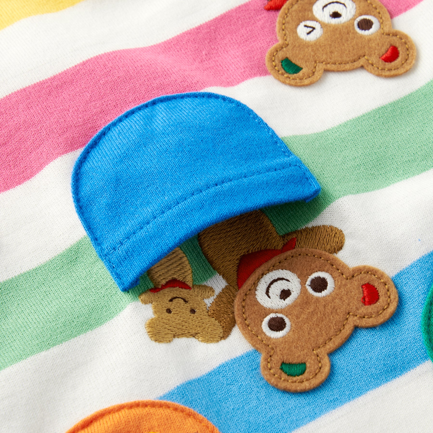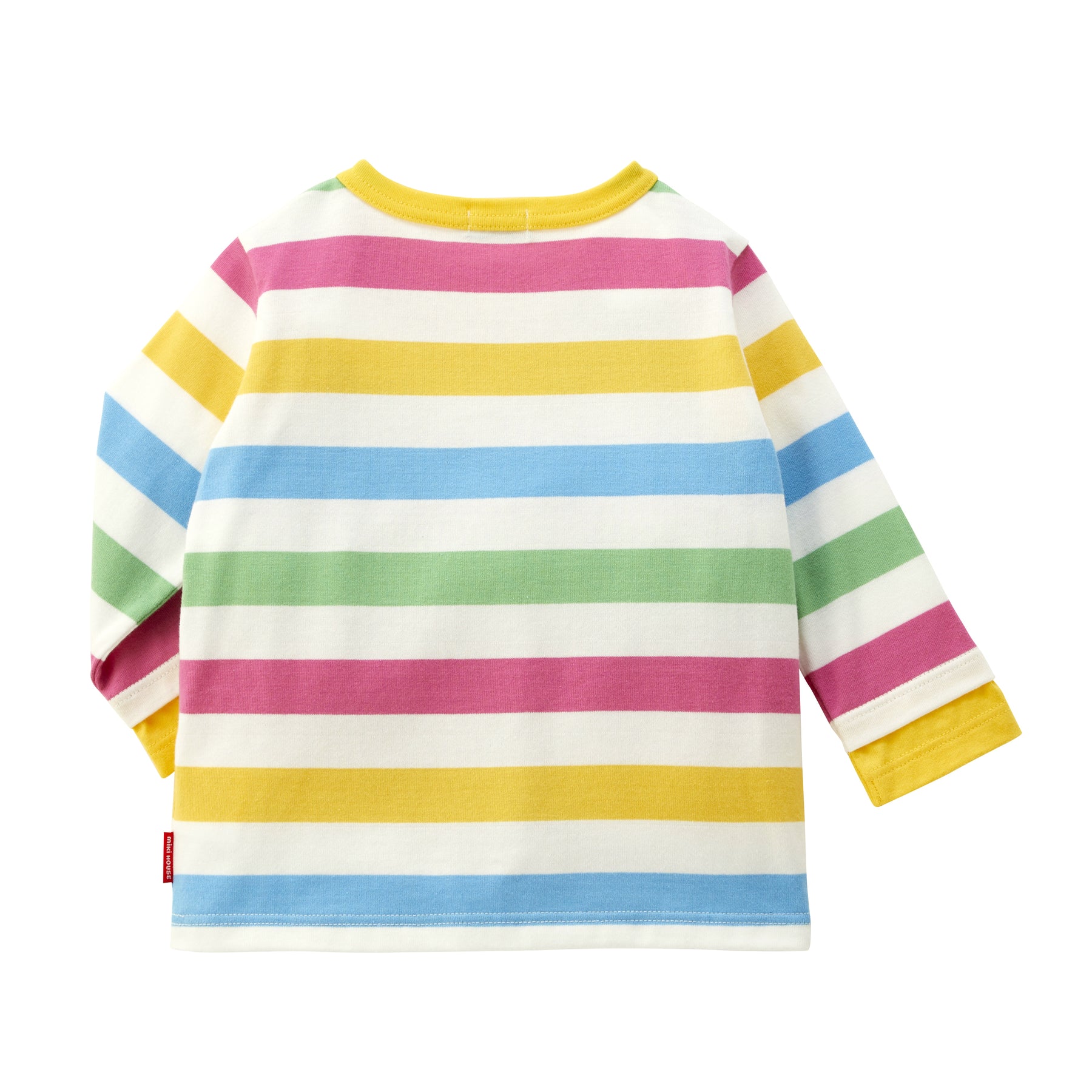 This is a long-sleeved T-shirt with cute colorful borders and pockets.