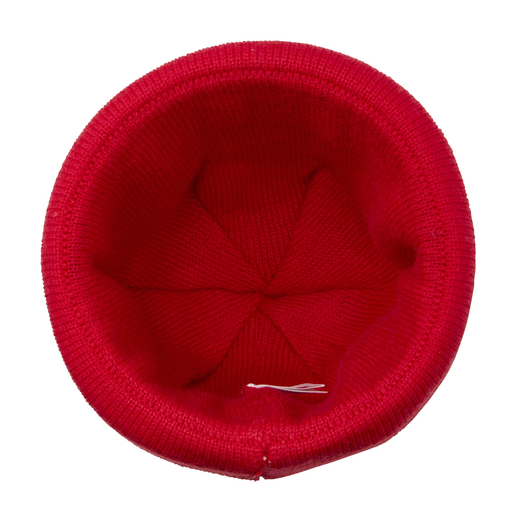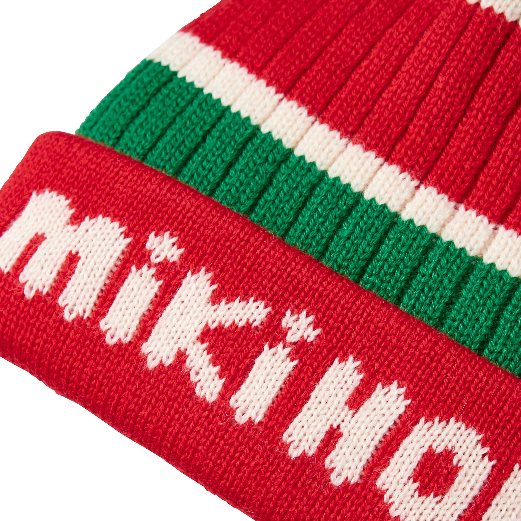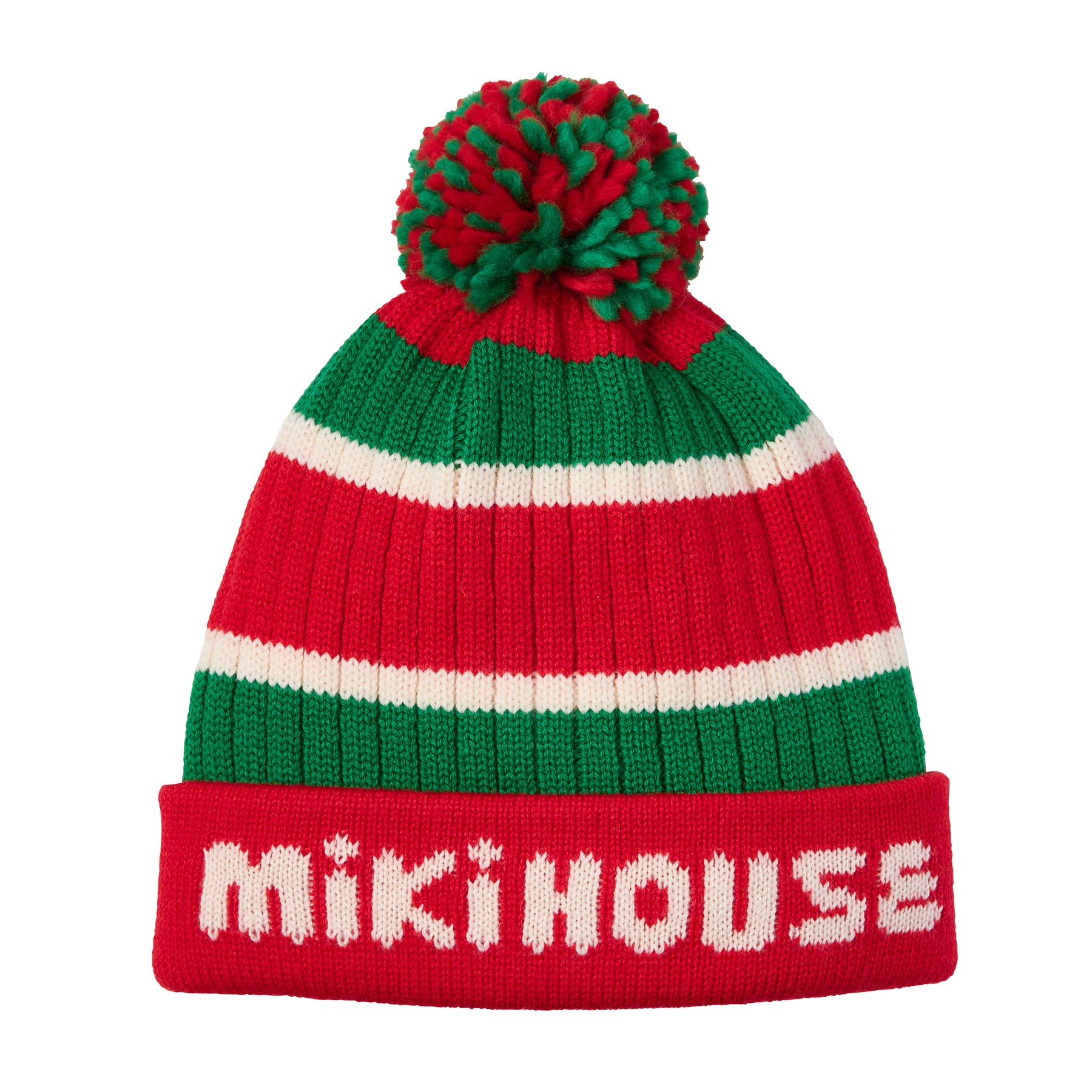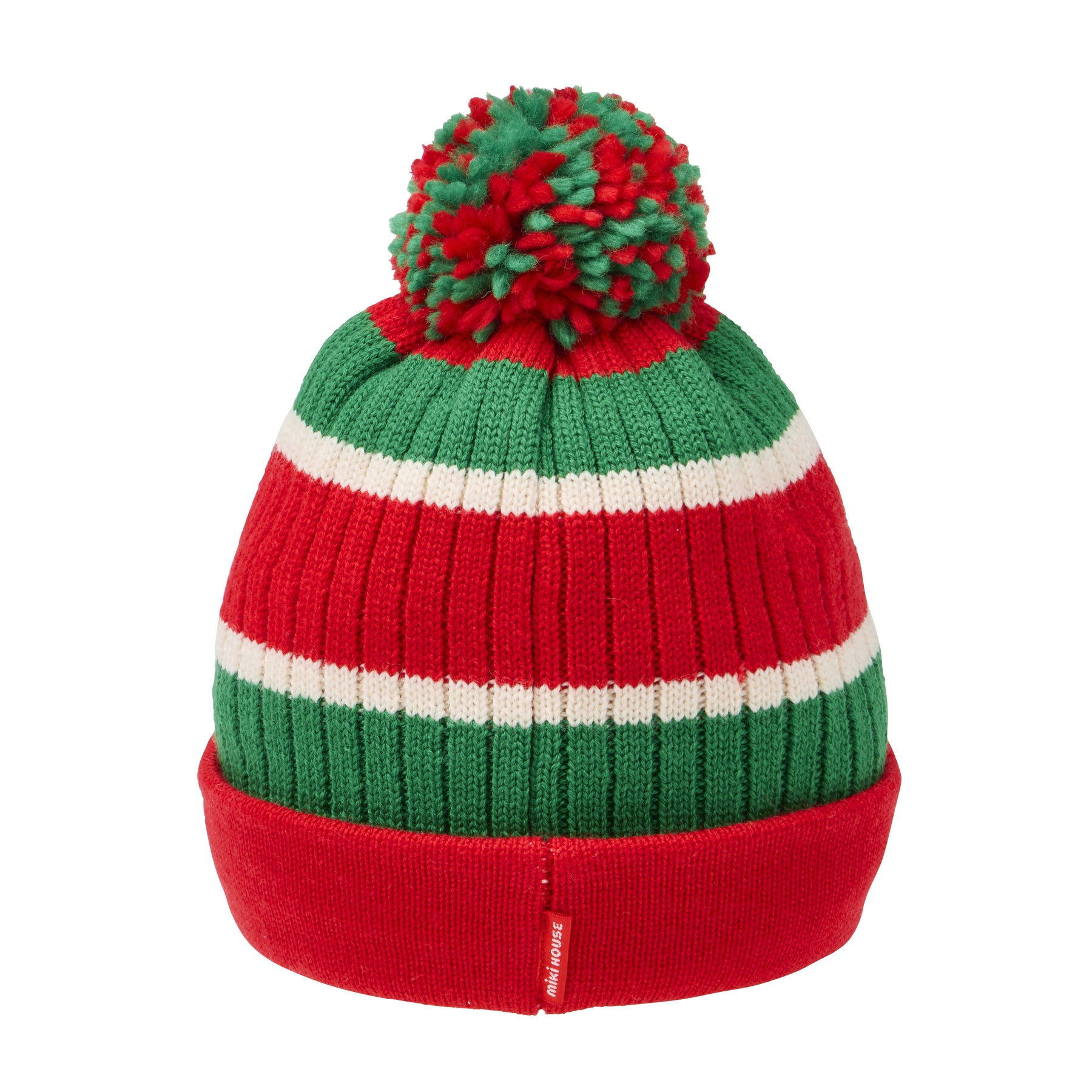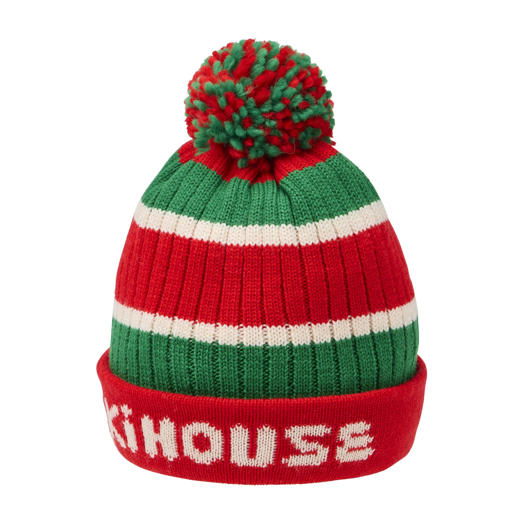 A knitted hat with a folded-up brim and distinctive pom-pom on top.