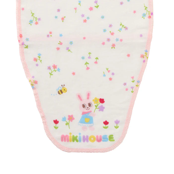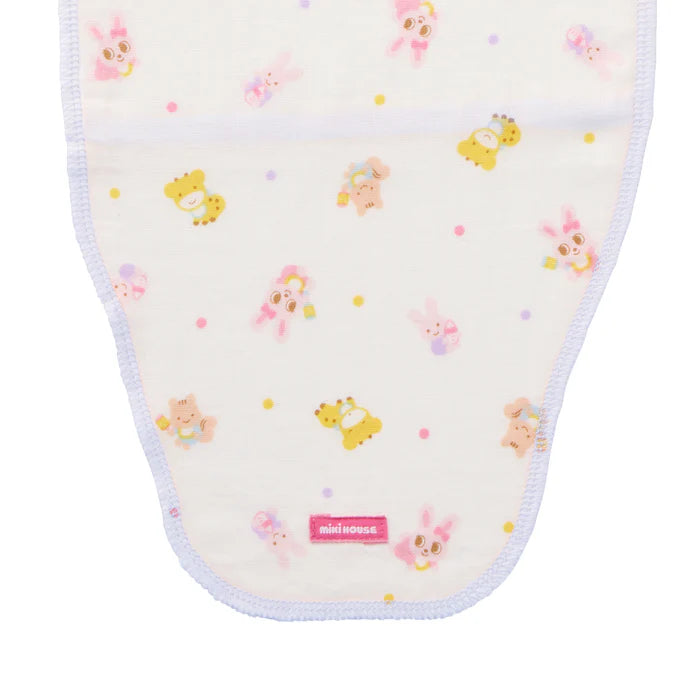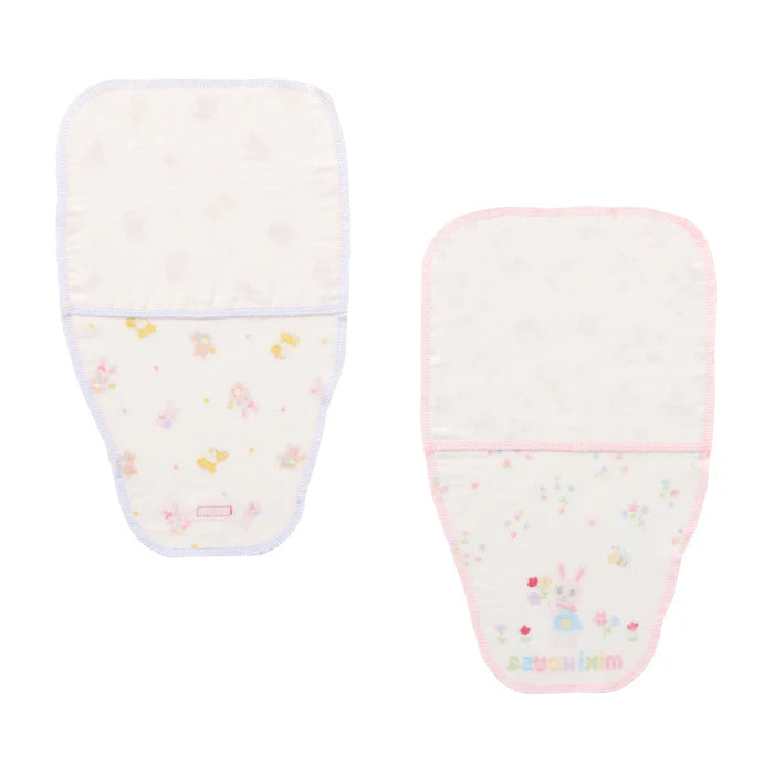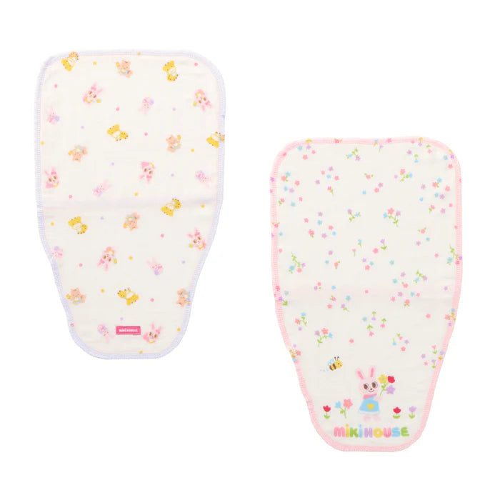 This is a set of absorbent sweat pads designed to soak up sweat from a baby's back. Place the pad between the baby's back and their undershirt, pulling the front end out from the back neckline like a collar. Features a handy pocket for easy insertion onto the baby's back—ideal for hot, humid seasons. Featuring Pucchi & Usako, popular characters from Mikihouse, now available in an adorable baby print!