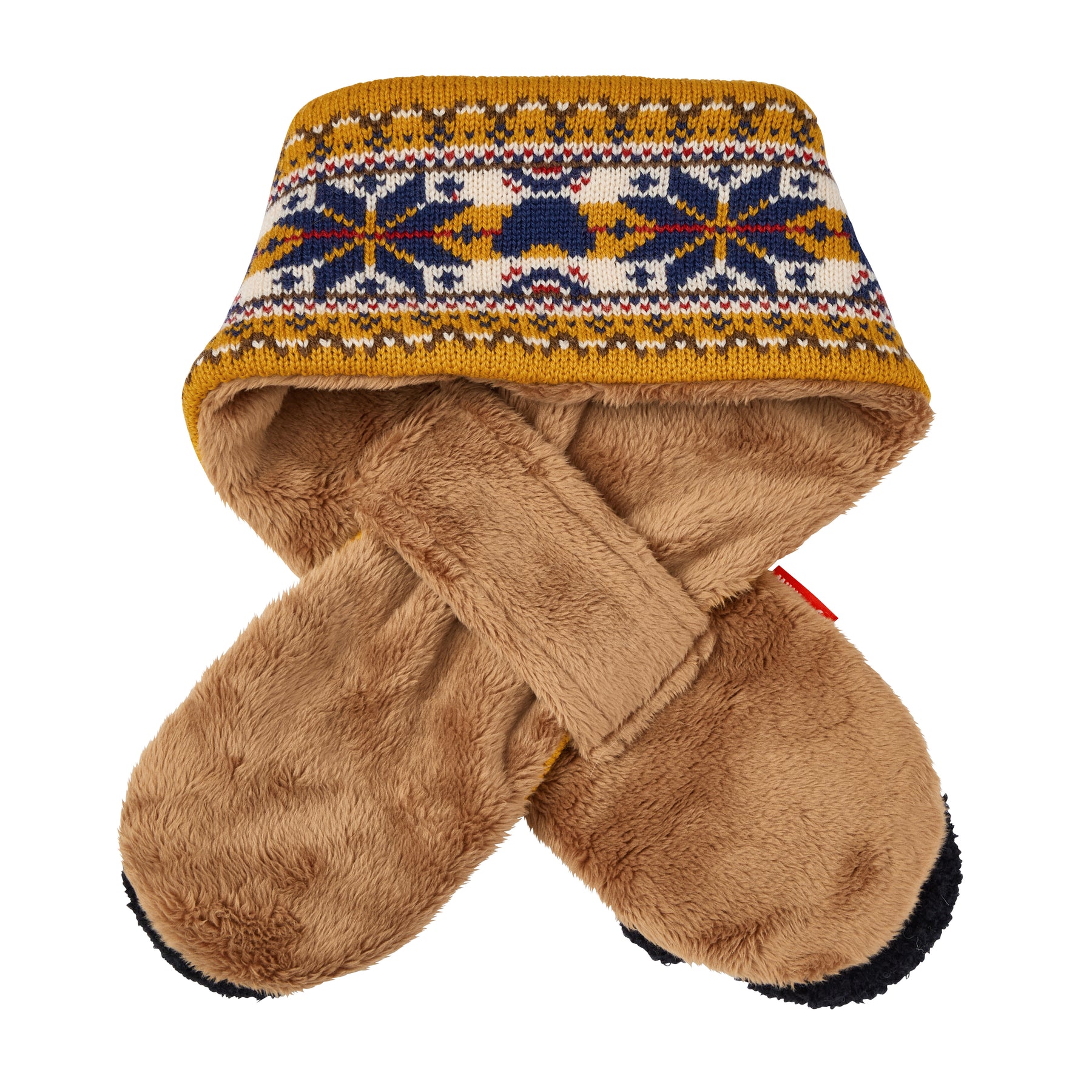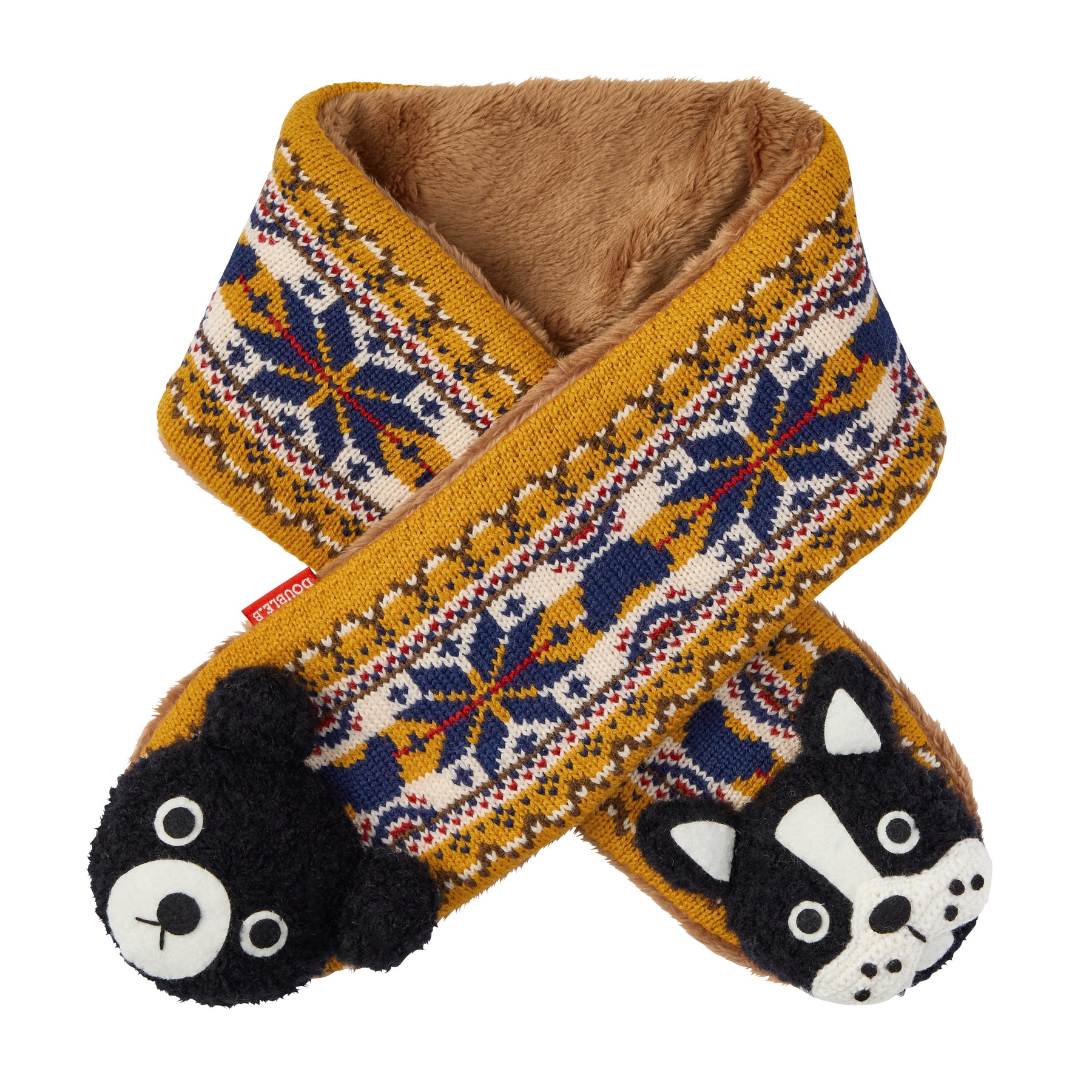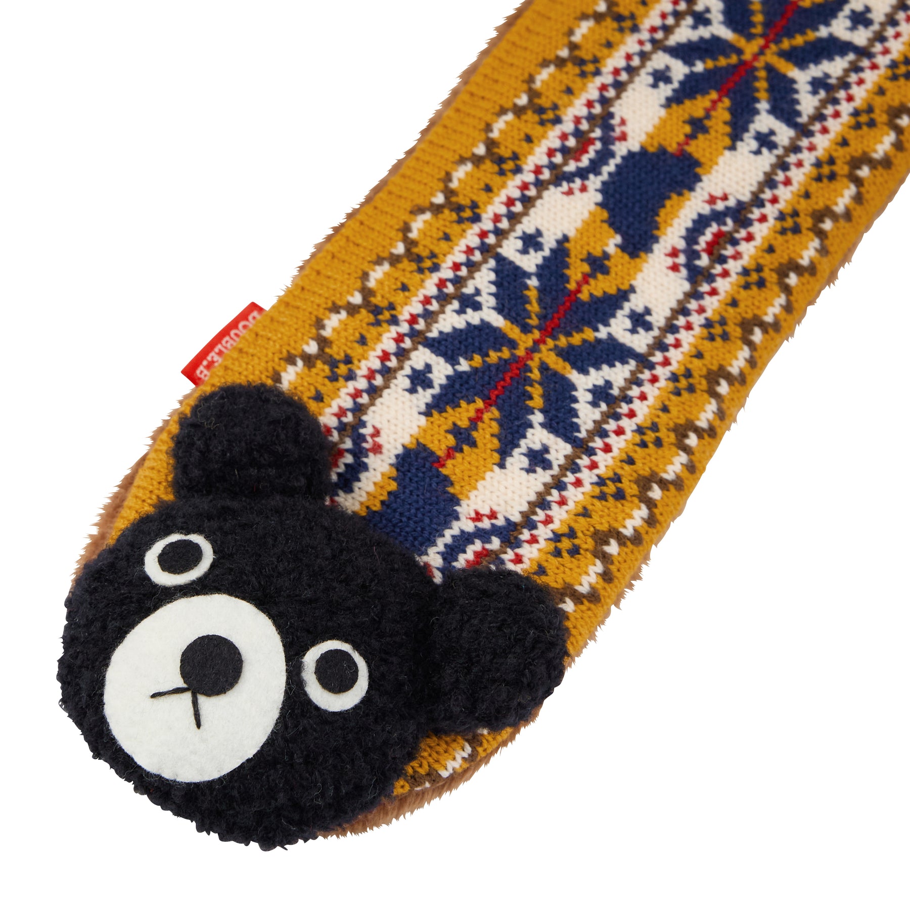 A scarf featuring a 3D knitted bear motif, based on a classic Nordic winter pattern. Made from an original blend of wool and acrylic, it retains the softness and warmth of pure wool without compromising its natural qualities—perfect for cold winter days.