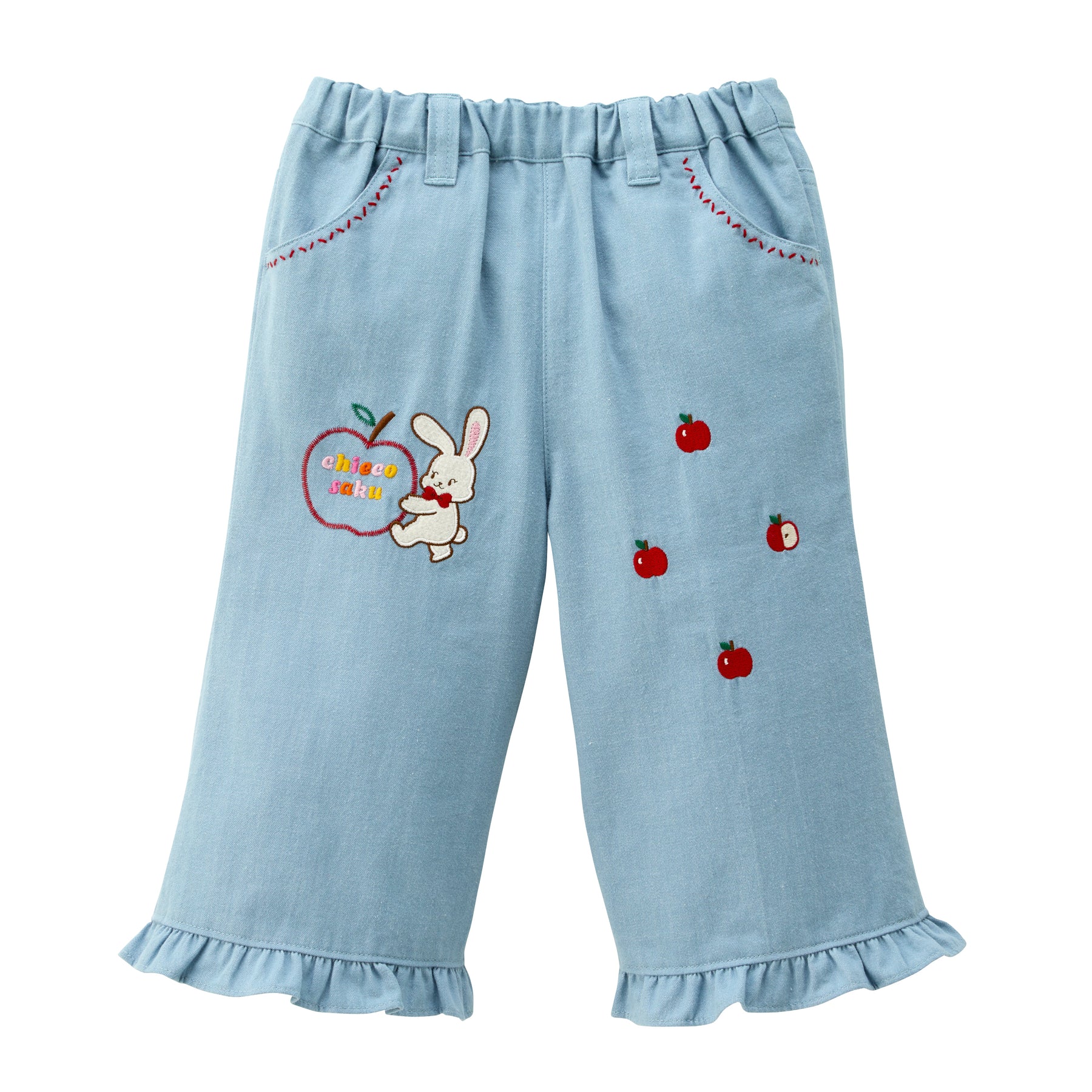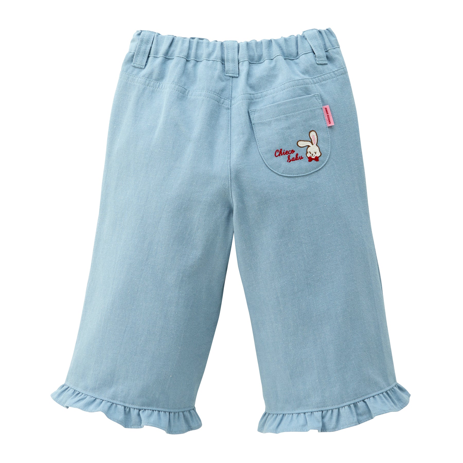 These are 9/10 length flared pants with cute frills at the hem for a girly look. The design has a slightly nostalgic, retro feel. With a relaxed silhouette, they are recommended for outings from early spring.