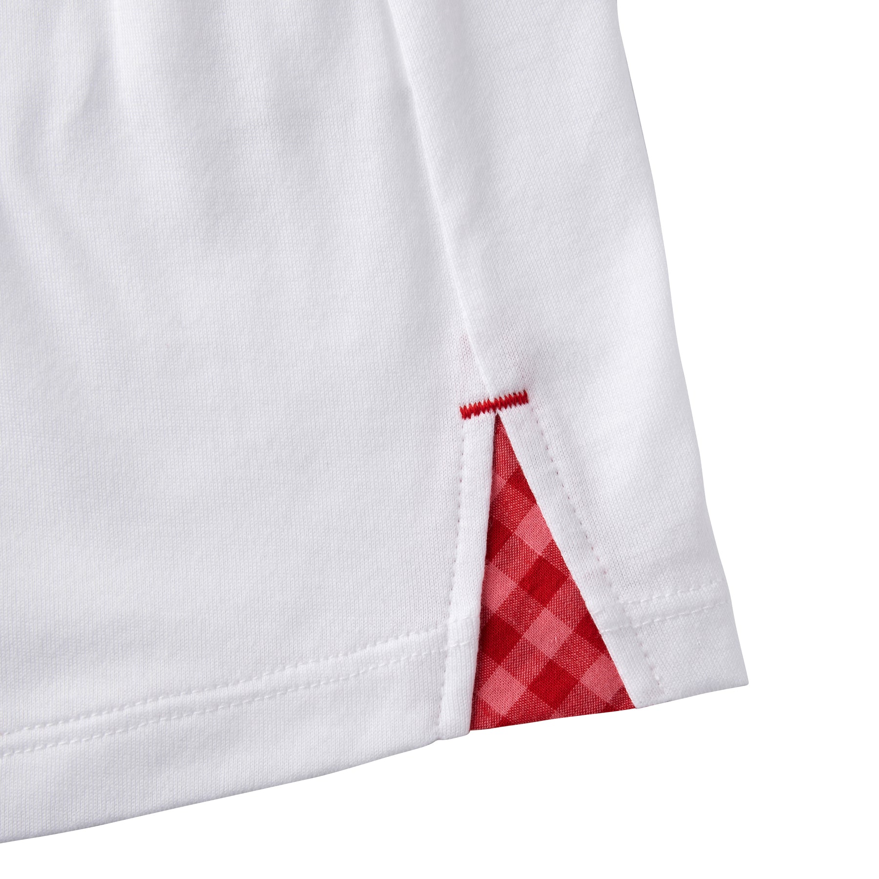 A T-shirt (short sleeves) with refreshing gingham check frills at the cuffs. It pairs well with gingham check overalls.