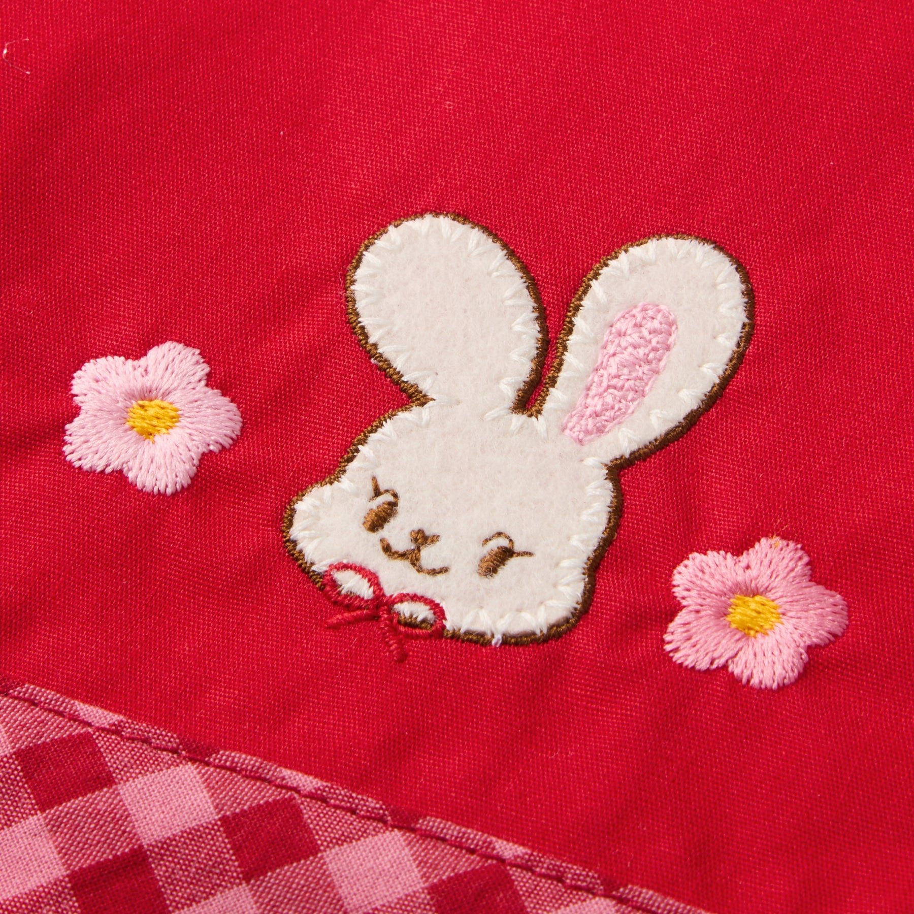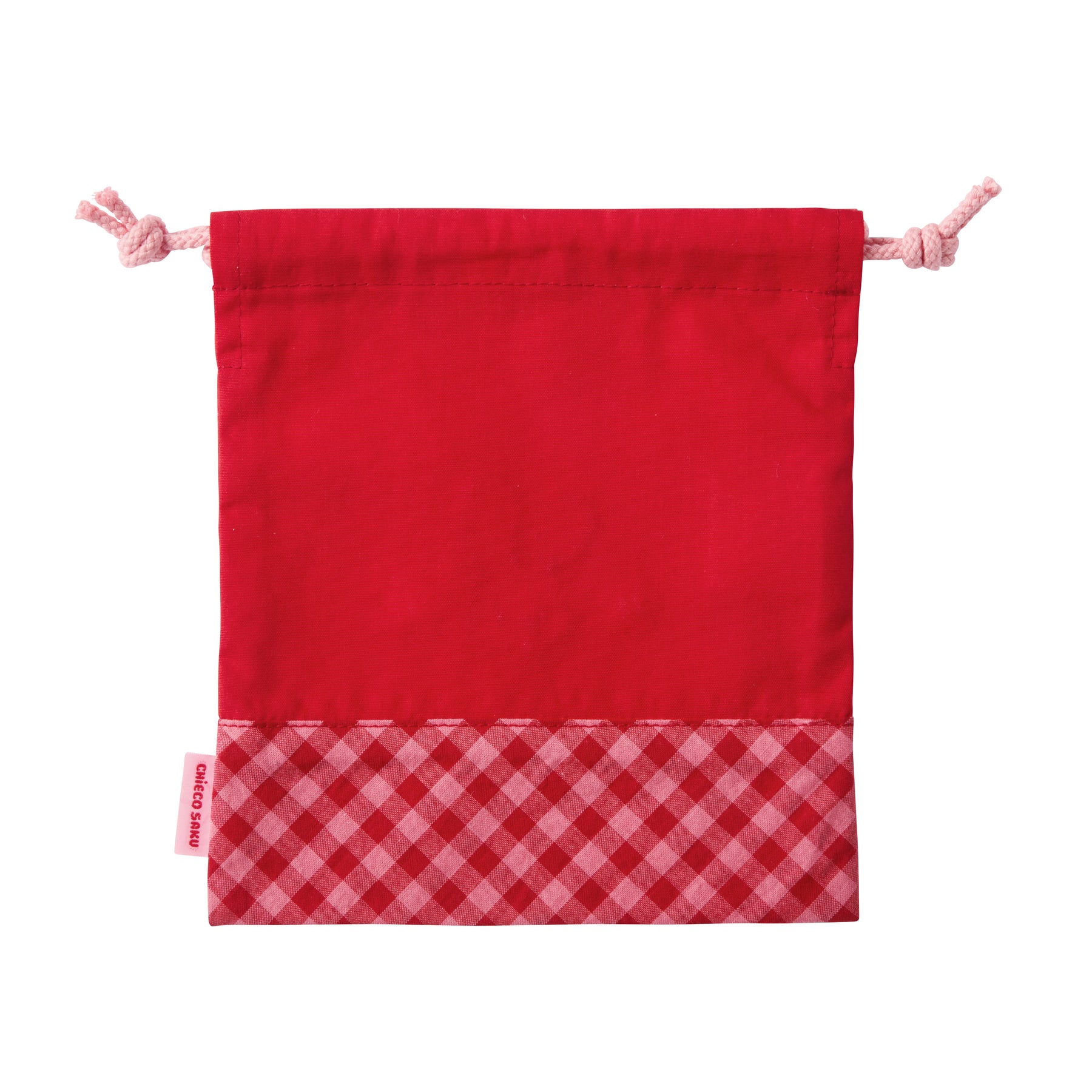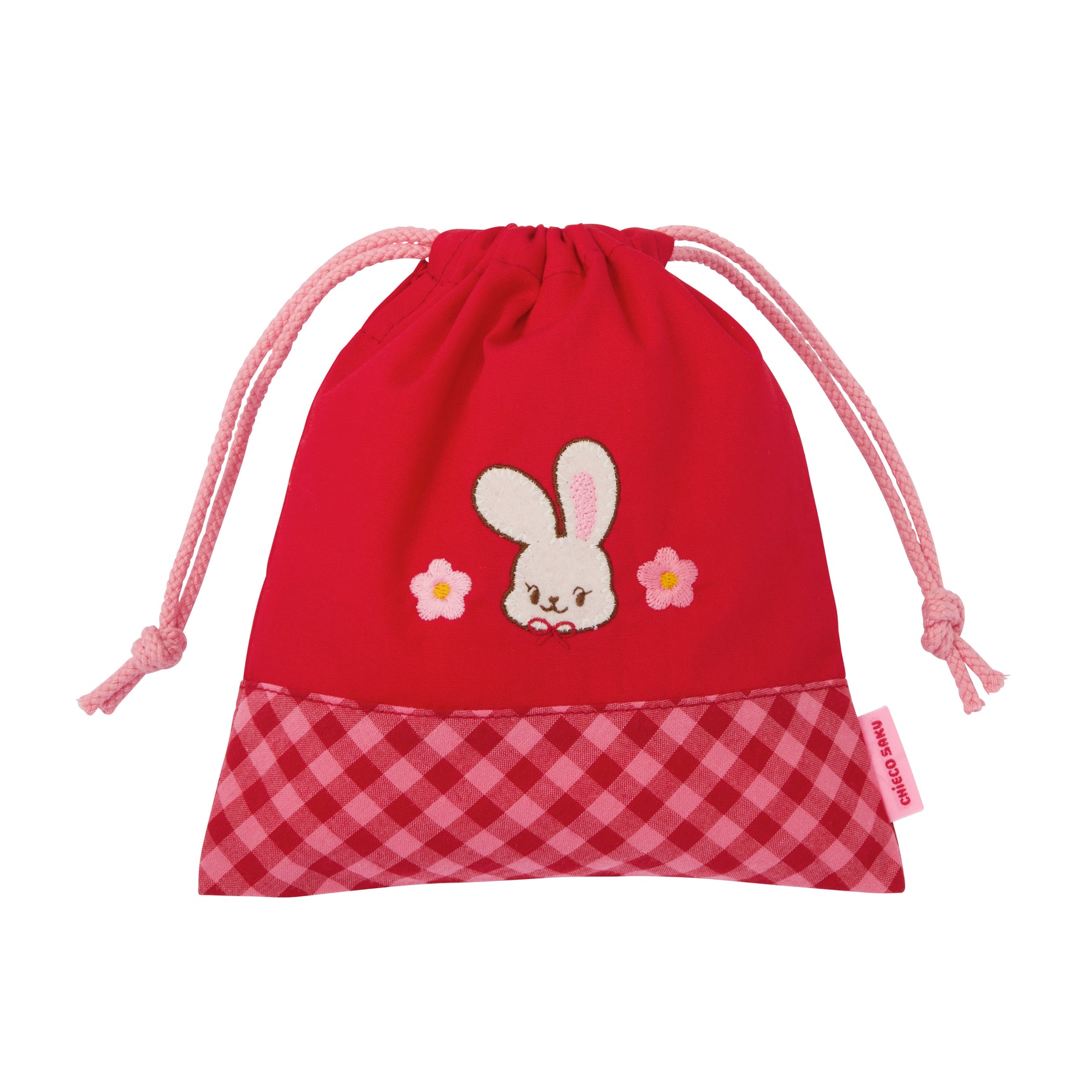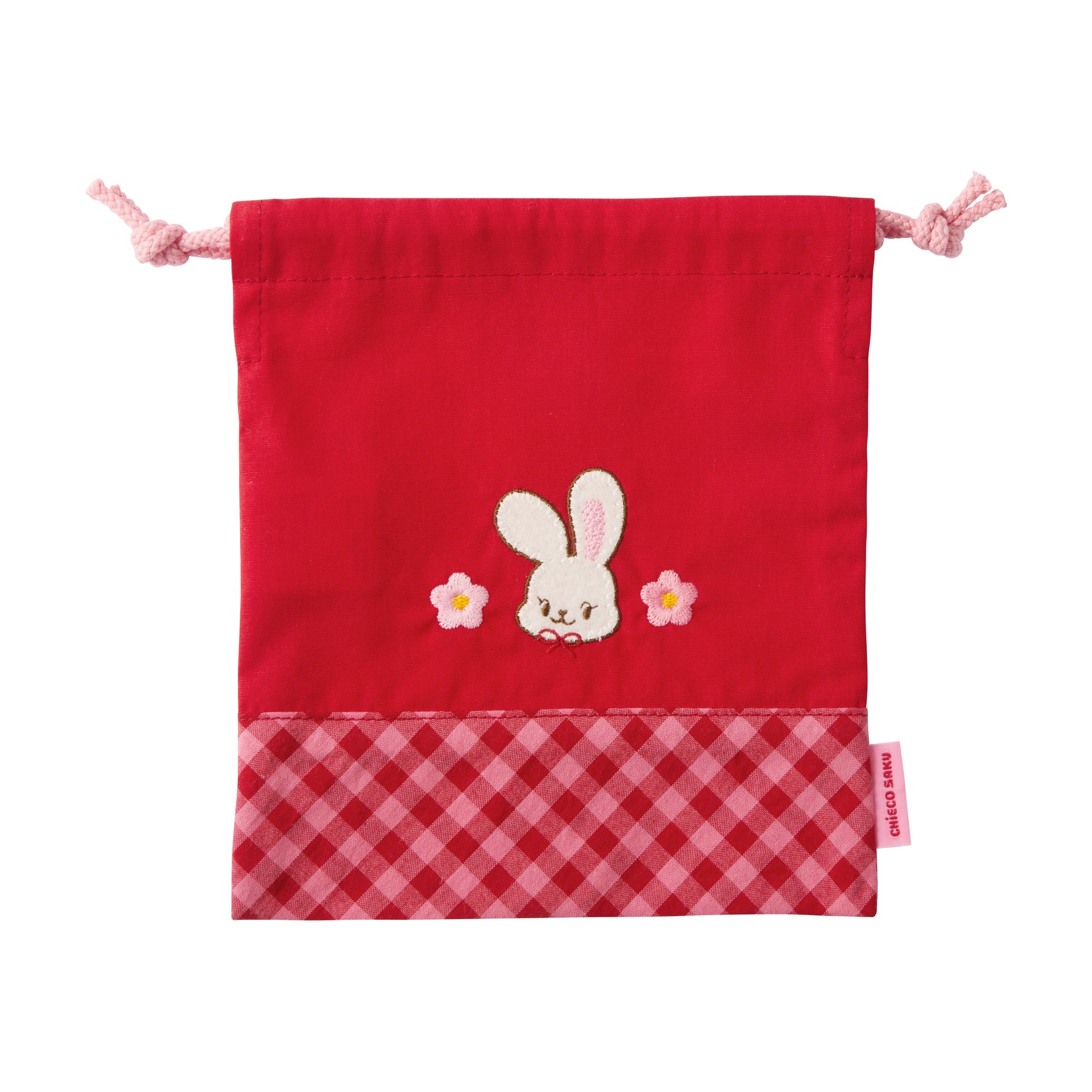 Goods featuring cute designs drawn by the rabbit “Chieko,” mainly in red and pink tones. This is a drawstring bag with a Chieko check pattern.
