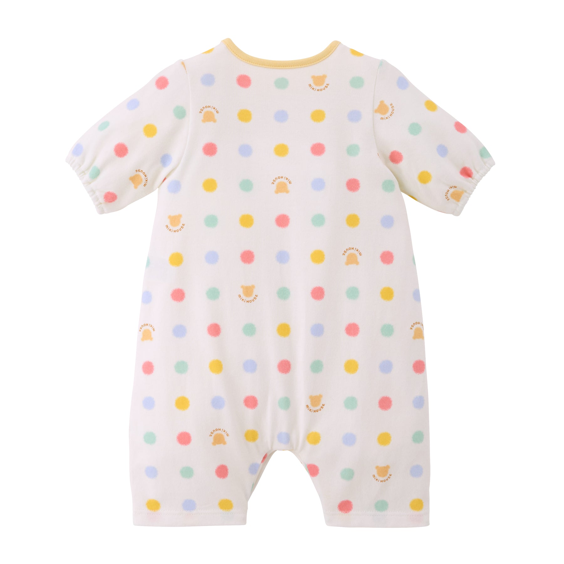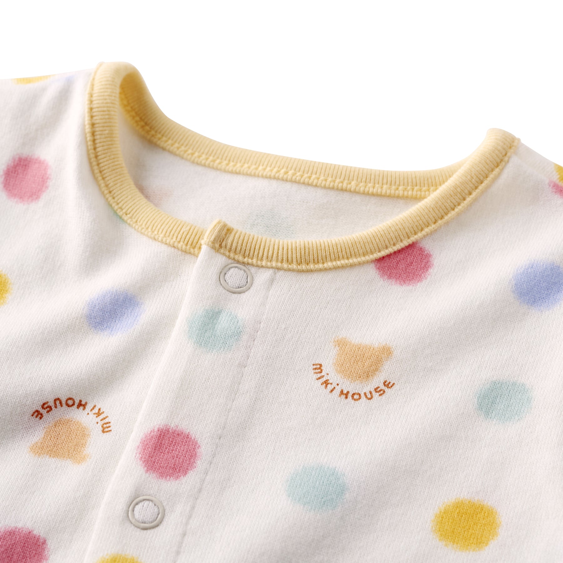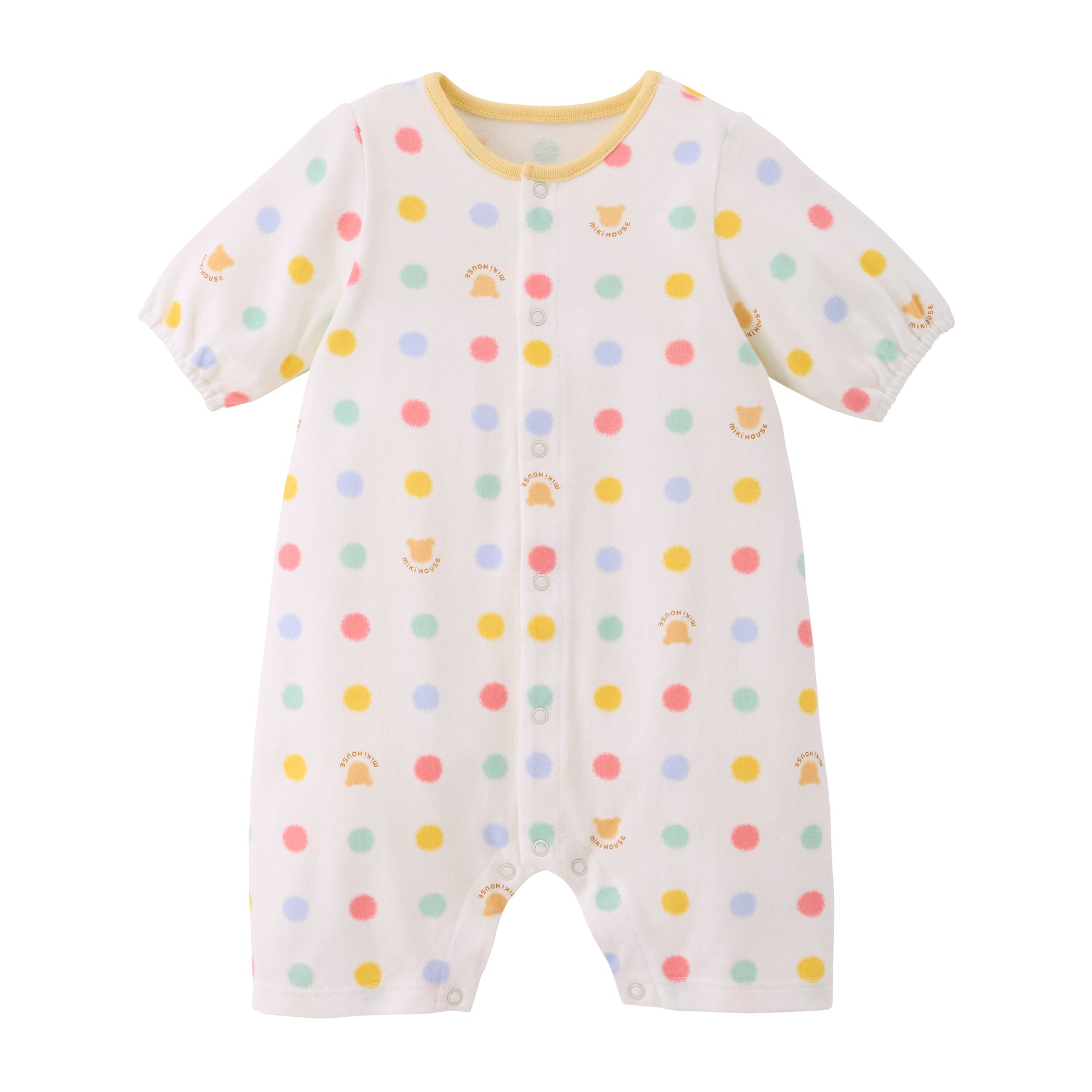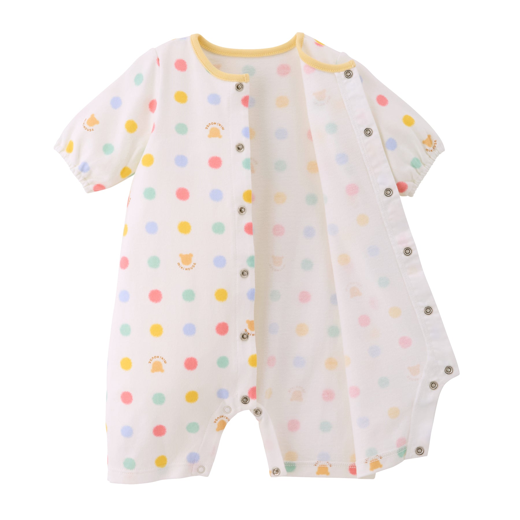 This is a pre-all-in-one with a multi-dot pattern. Compared to a two-way all-in-one, it has shorter sleeves and length, making it a newborn wear that fits well and can be worn comfortably right after birth. It is a convenient item for preparing for childbirth, celebrating a birth, or as a gift.