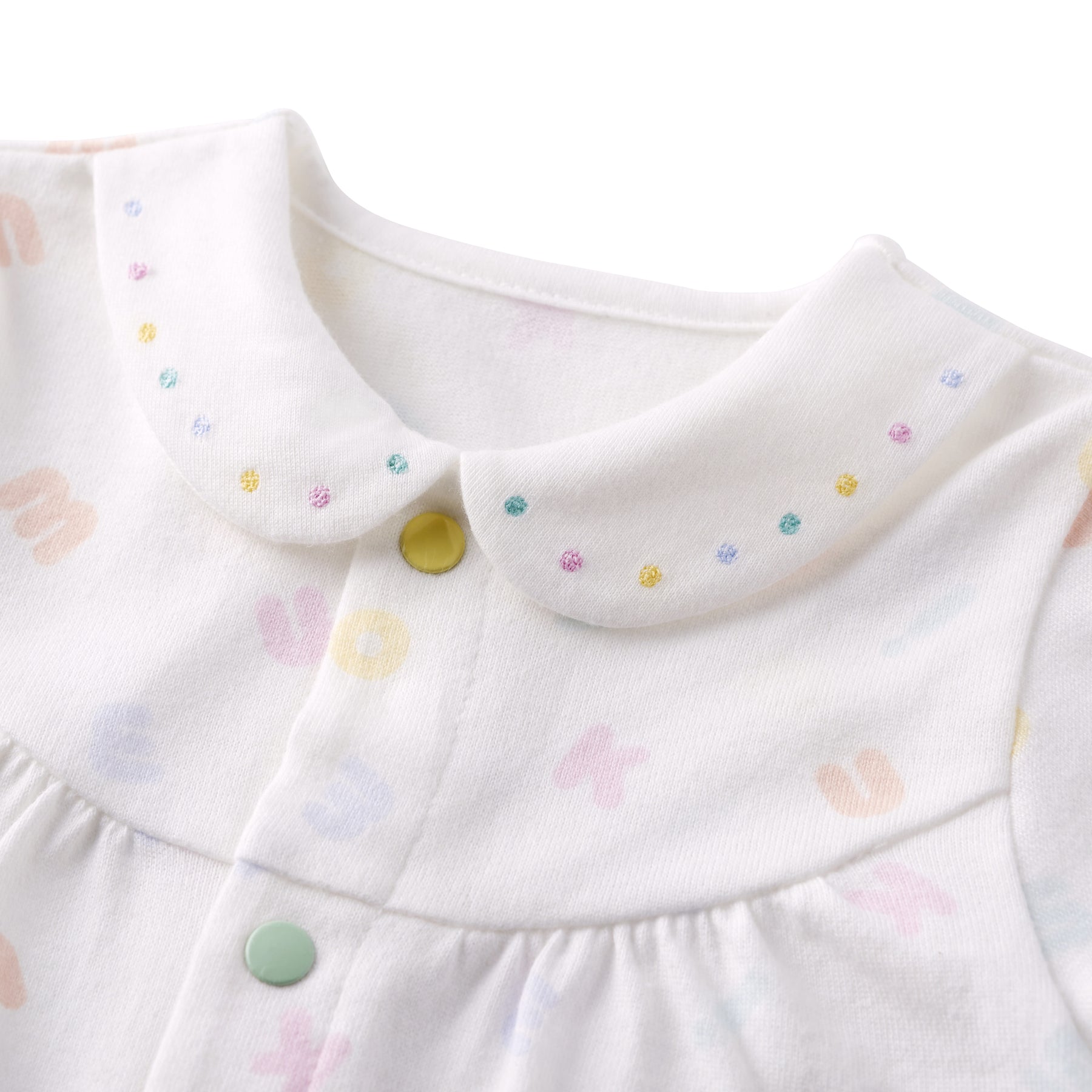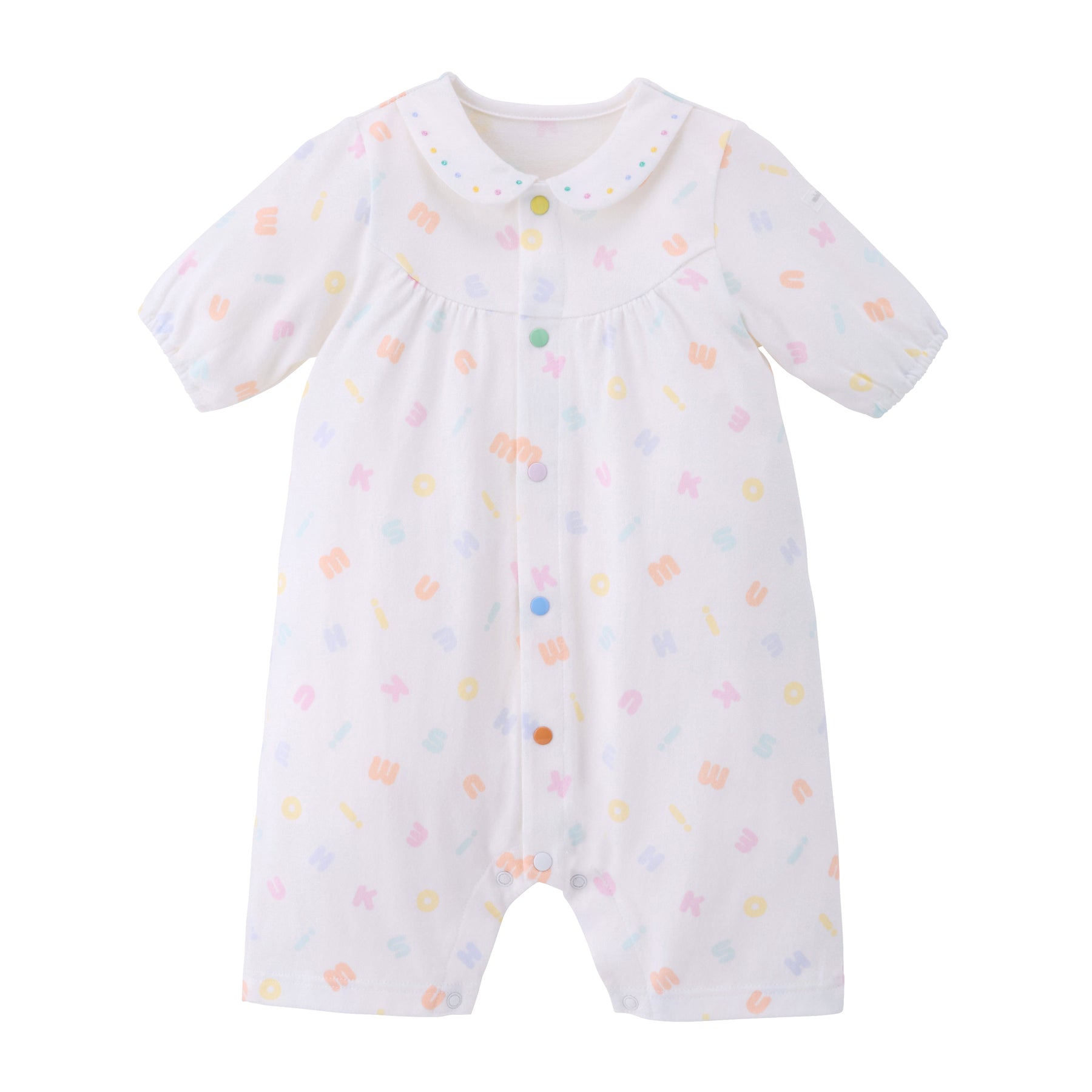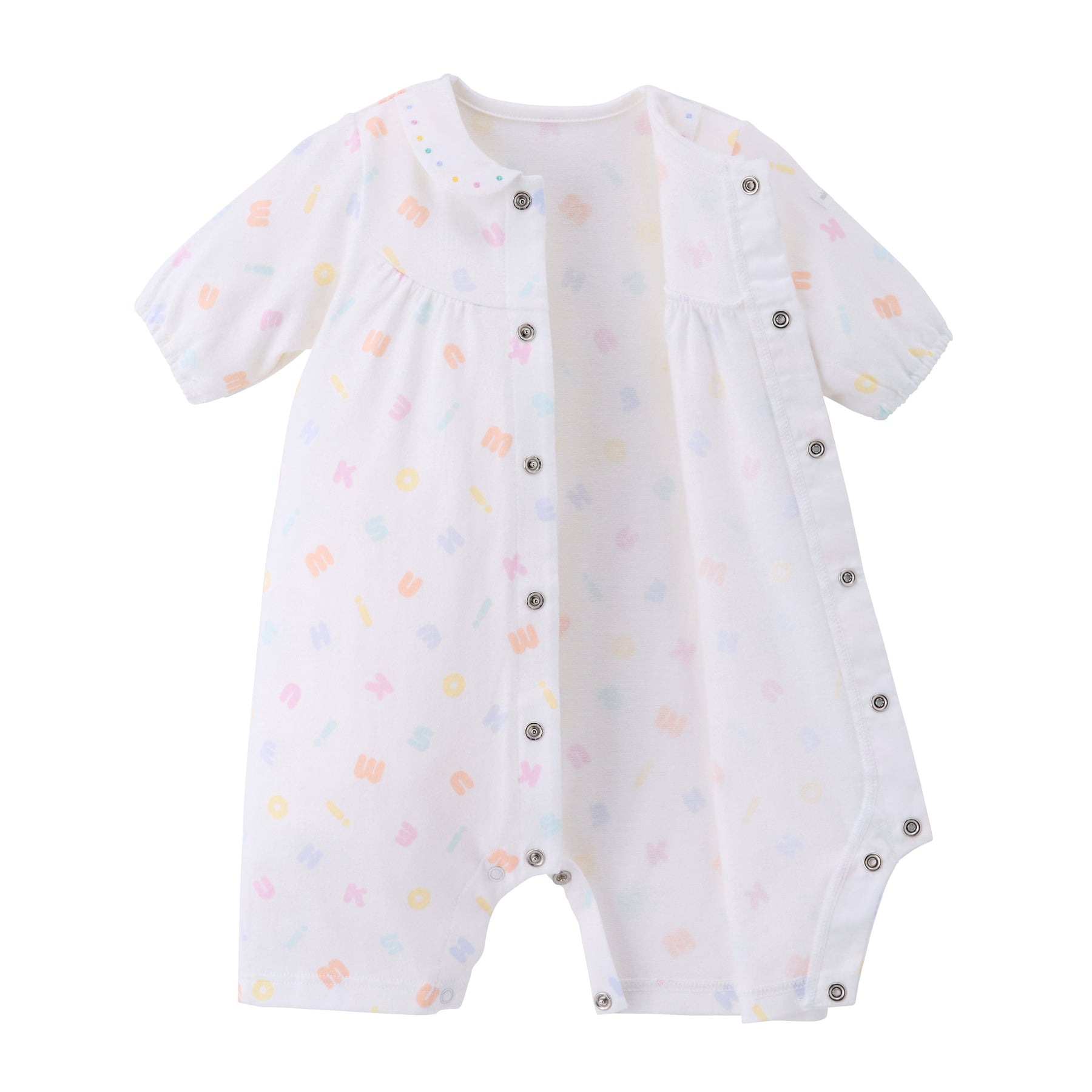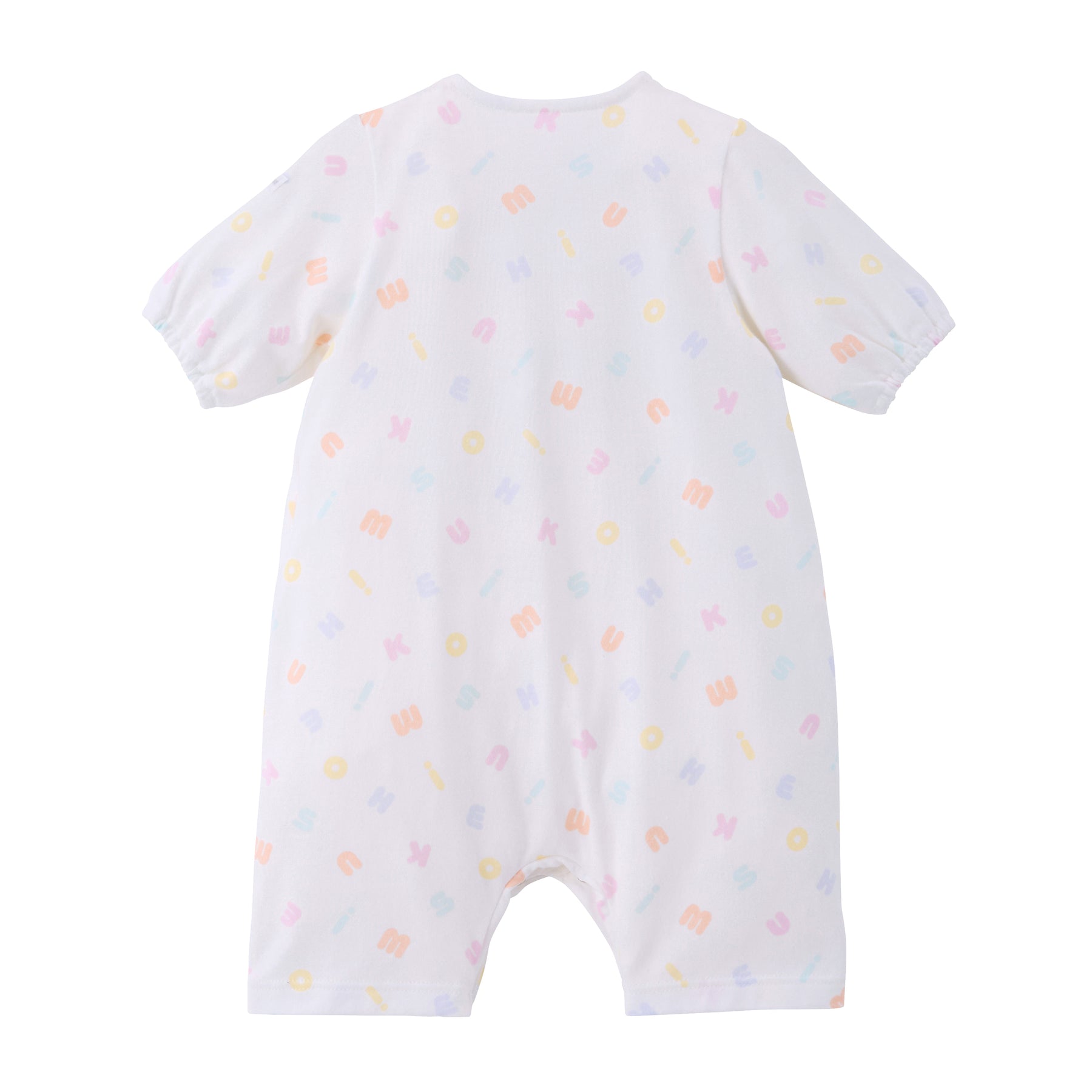 This is a pastel logo patterned pre-all-in-one. Compared to a two-way all-in-one, the sleeves and length are shorter, making it a newborn wear that fits well and can be worn right after birth. It is a convenient item for preparing for childbirth, celebrating a birth, or as a gift.