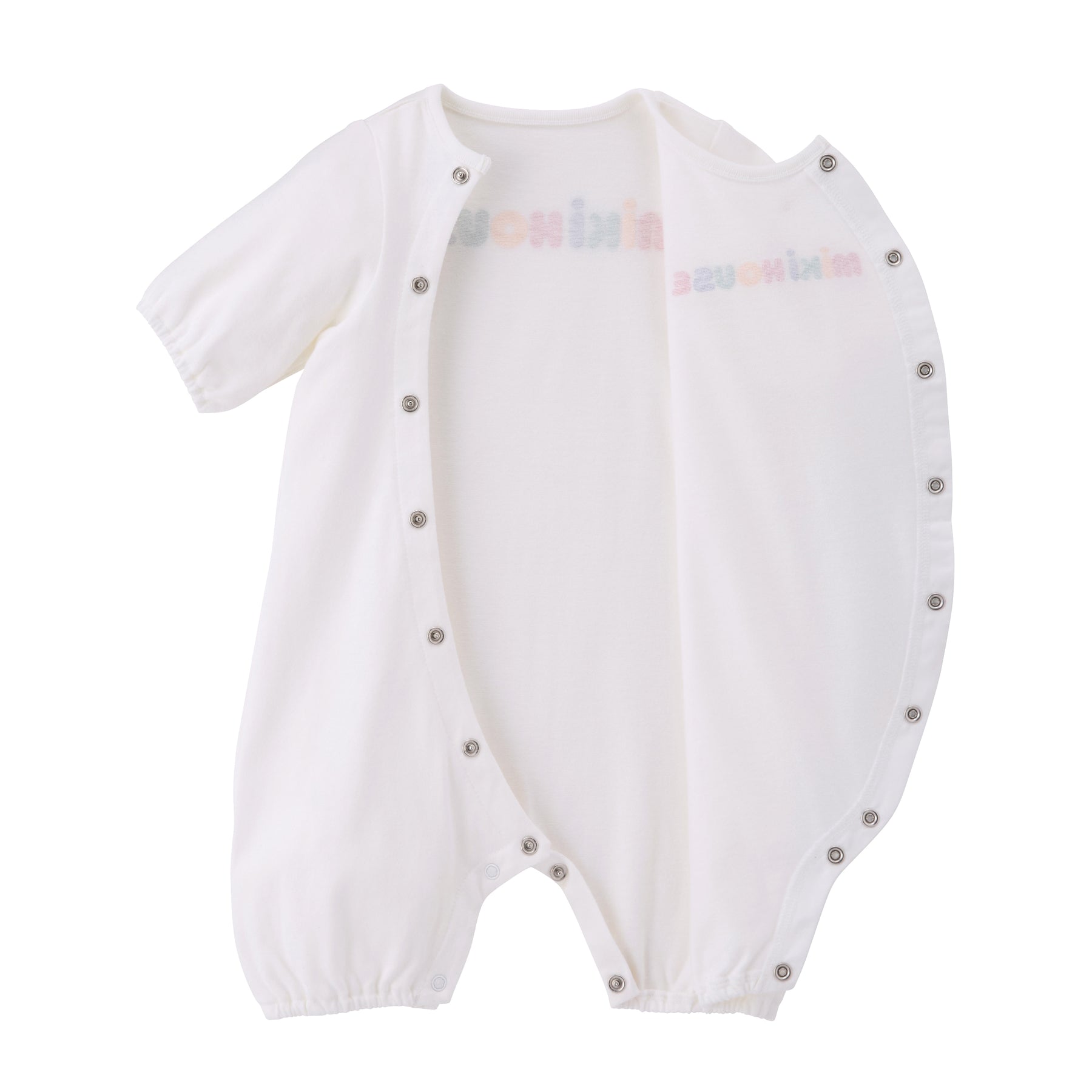This is a playsuit with a back logo pattern. Compared to a two-way all-in-one, it has shorter sleeves and length, making it a newborn wear that fits well and can be worn right after birth. It is a convenient item for preparing for childbirth, celebrating a birth, or as a gift.