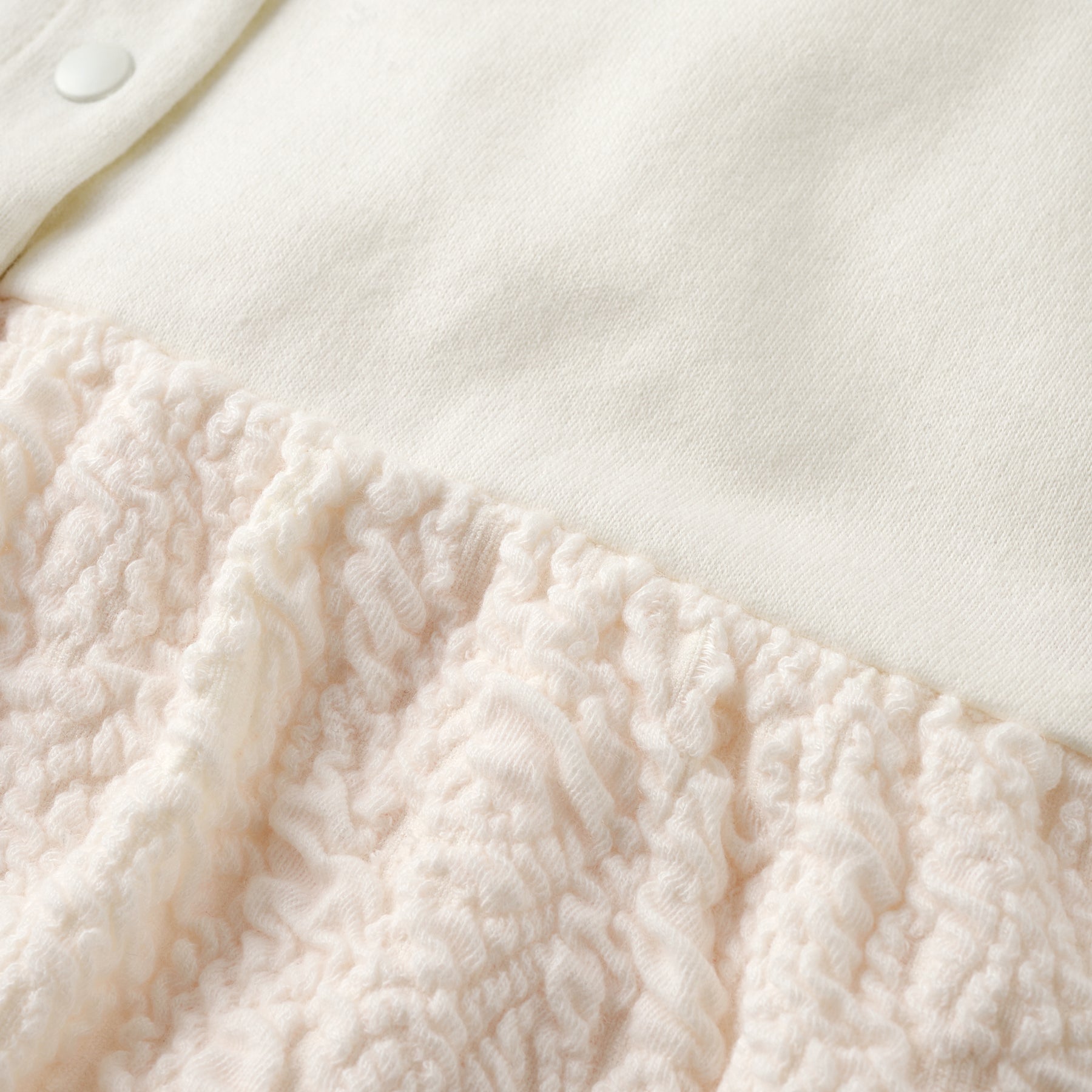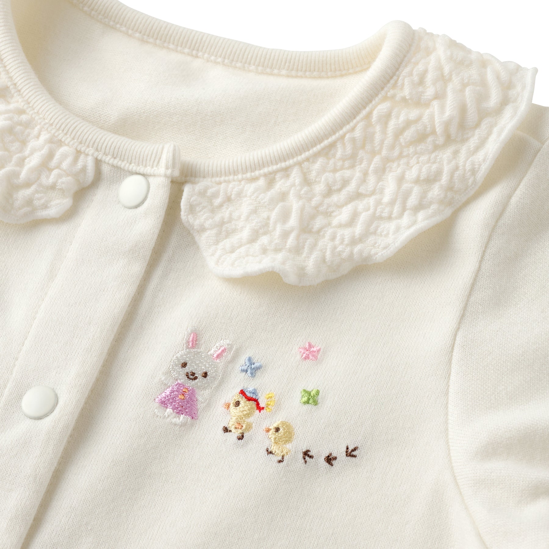This is a coverall (long-sleeved romper) with embroidery of a rabbit and flowers. A single piece that looks like a separate outfit, with an elegant, girly design. Recommended as a birth preparation item or a baby gift when coordinated with a cotton sleeper, bib, and socks.
