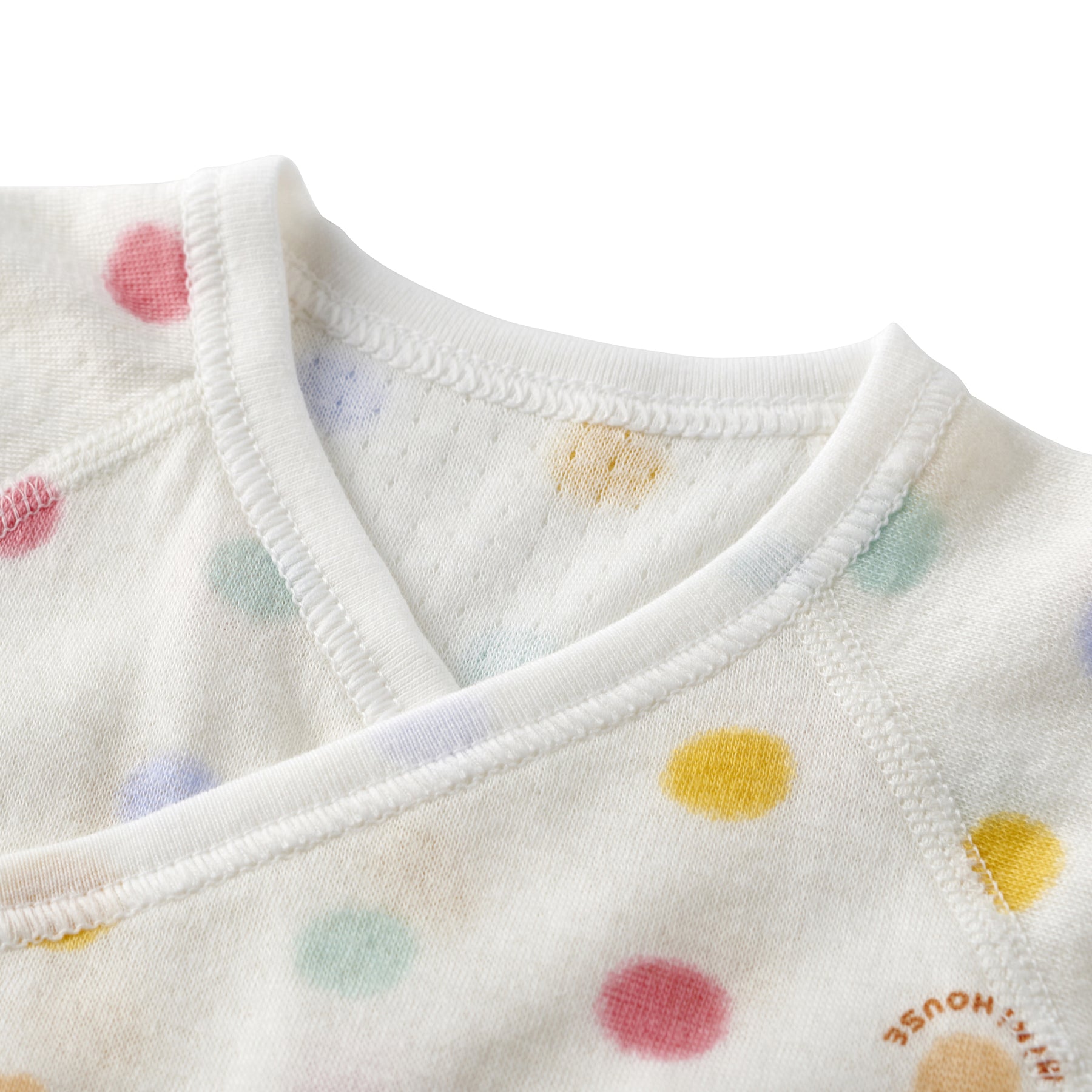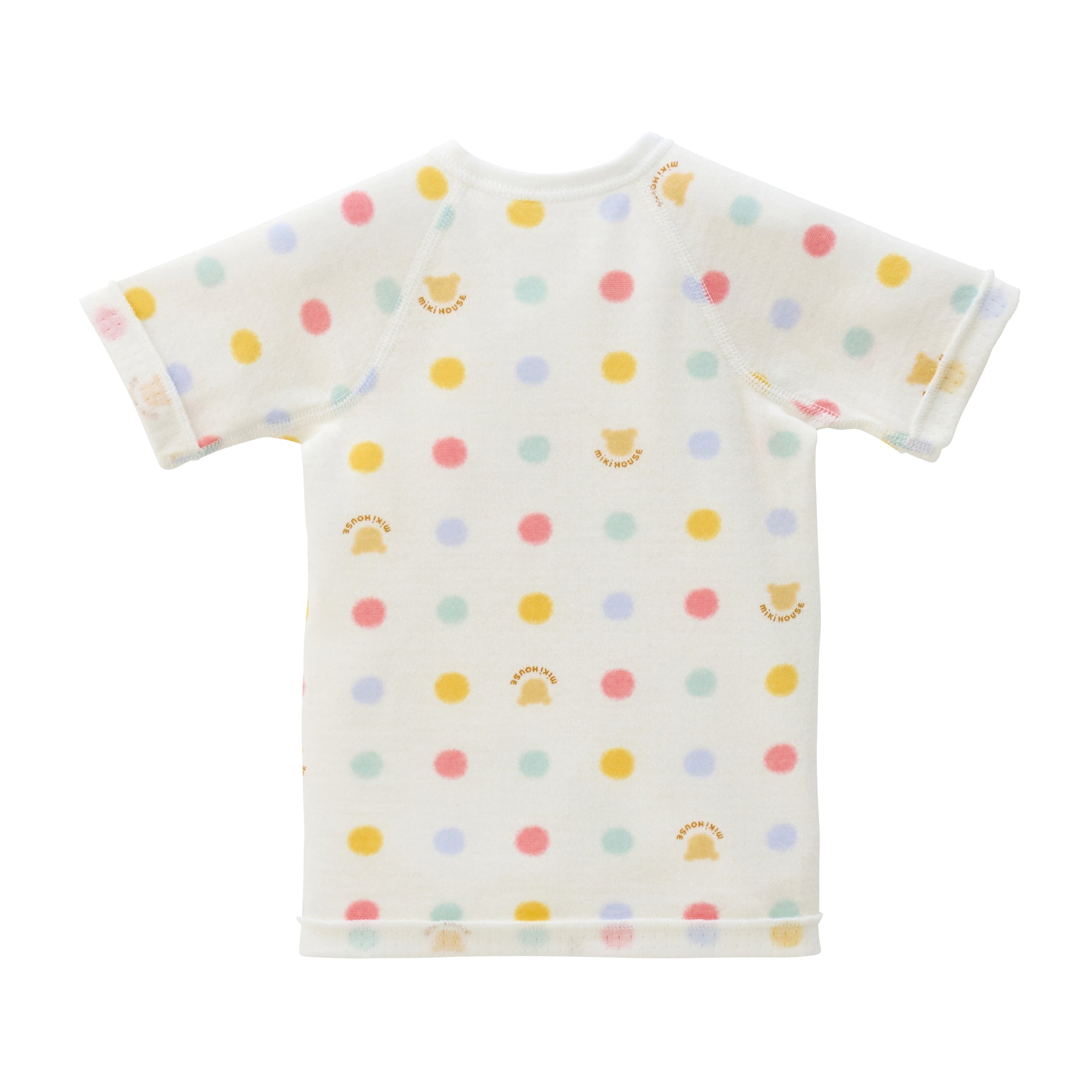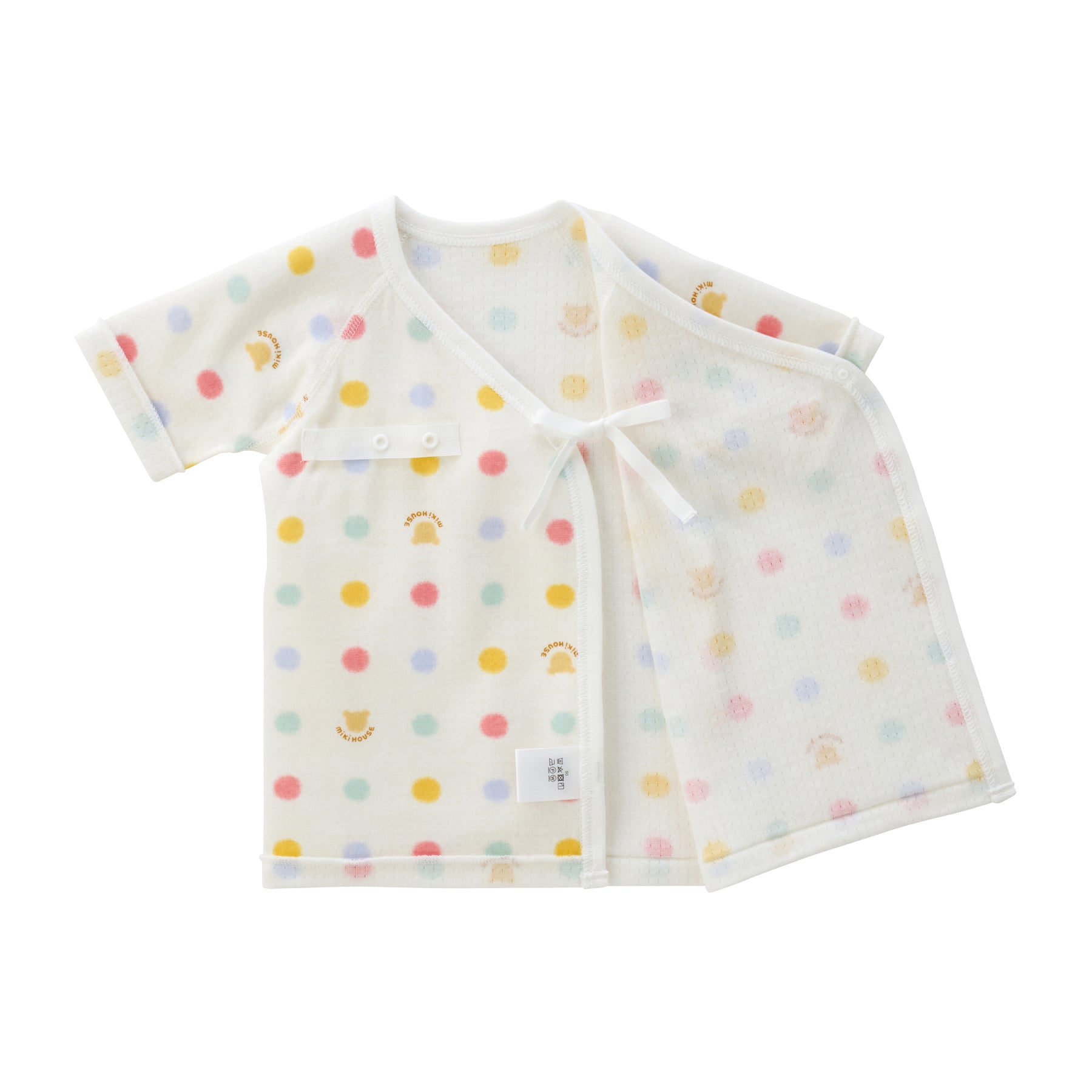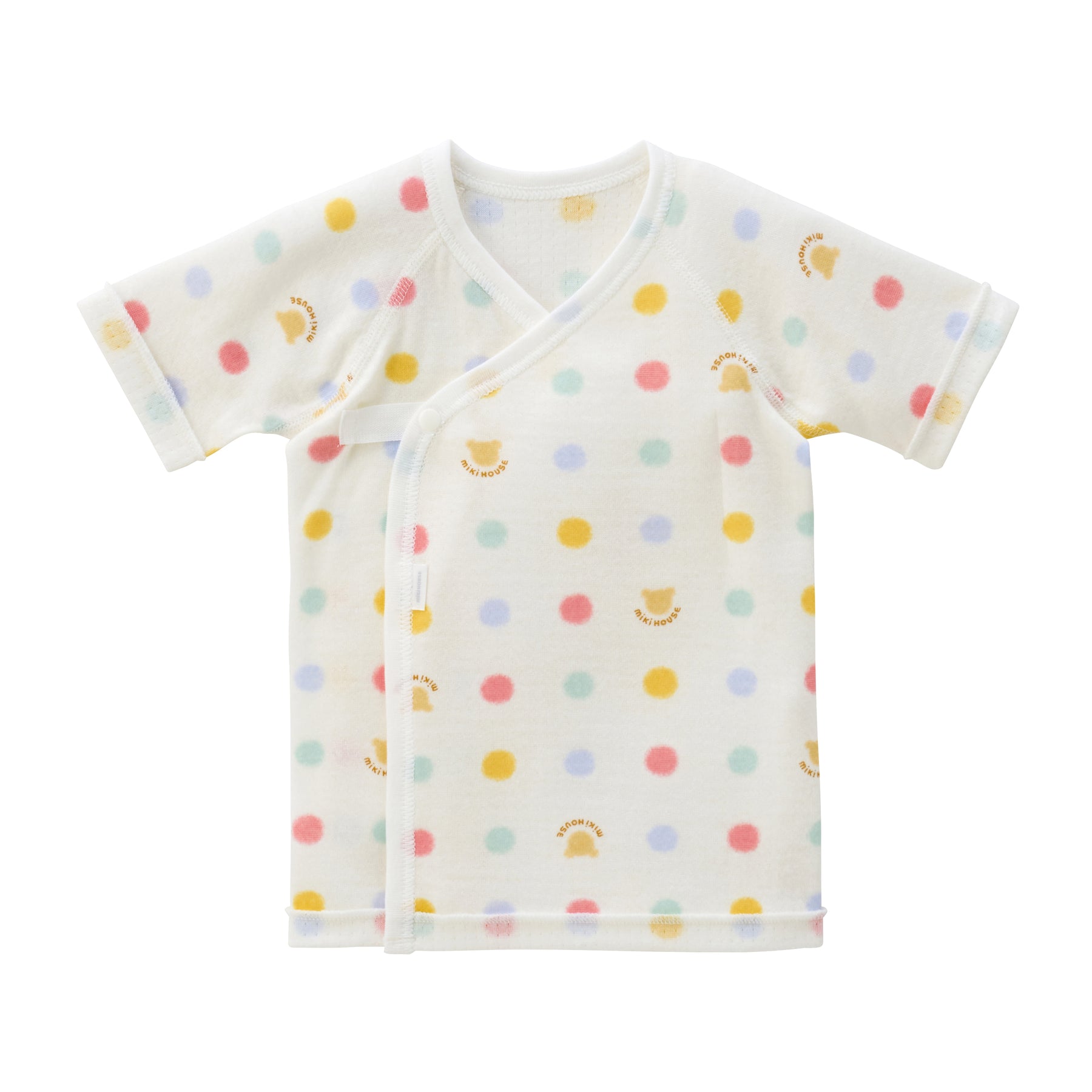 This is a short undershirt made of soft double-layer knit gauze material. It features a multi-dot and block logo print pattern. A newborn undershirt with hook fastenings that makes changing clothes easier. Recommended for preparing for childbirth, as a birth celebration, or as a gift.