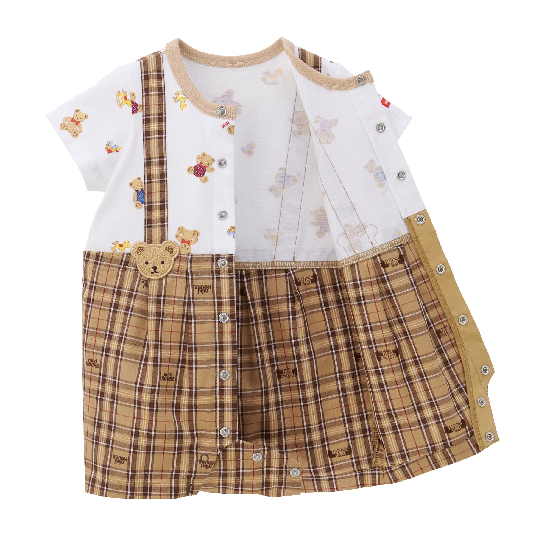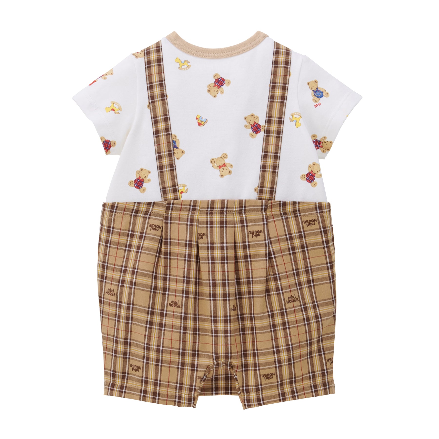 This is a short all-in-one with a Miki House design pattern that looks like suspender pants. The separate-style item is a popular design and is recommended as a gift for a newborn celebration or present.