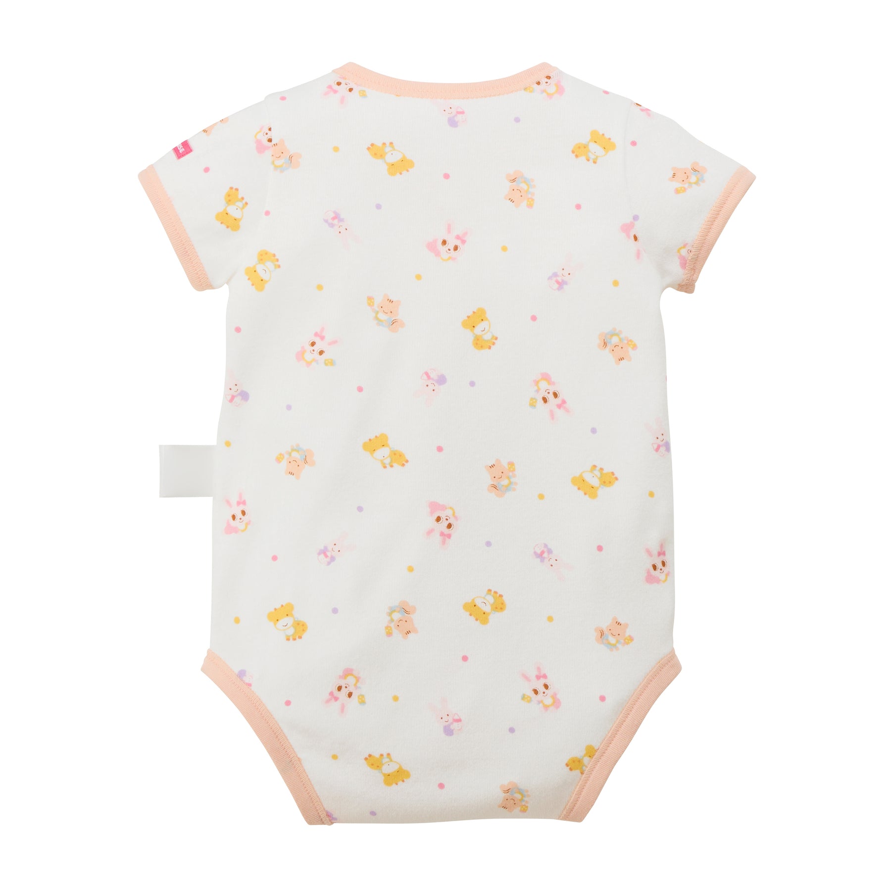 A short-sleeved bodysuit made of ribbed fabric that can be worn comfortably at any time of the year. Popular Miki House patterns now appear in baby designs: Baby Usako and Baby Animal. A floral print pattern, popular with girls, is also available. This bodysuit, which can be used as underwear, is a convenient undergarment once your baby has outgrown short undershirts and combination undershirts.