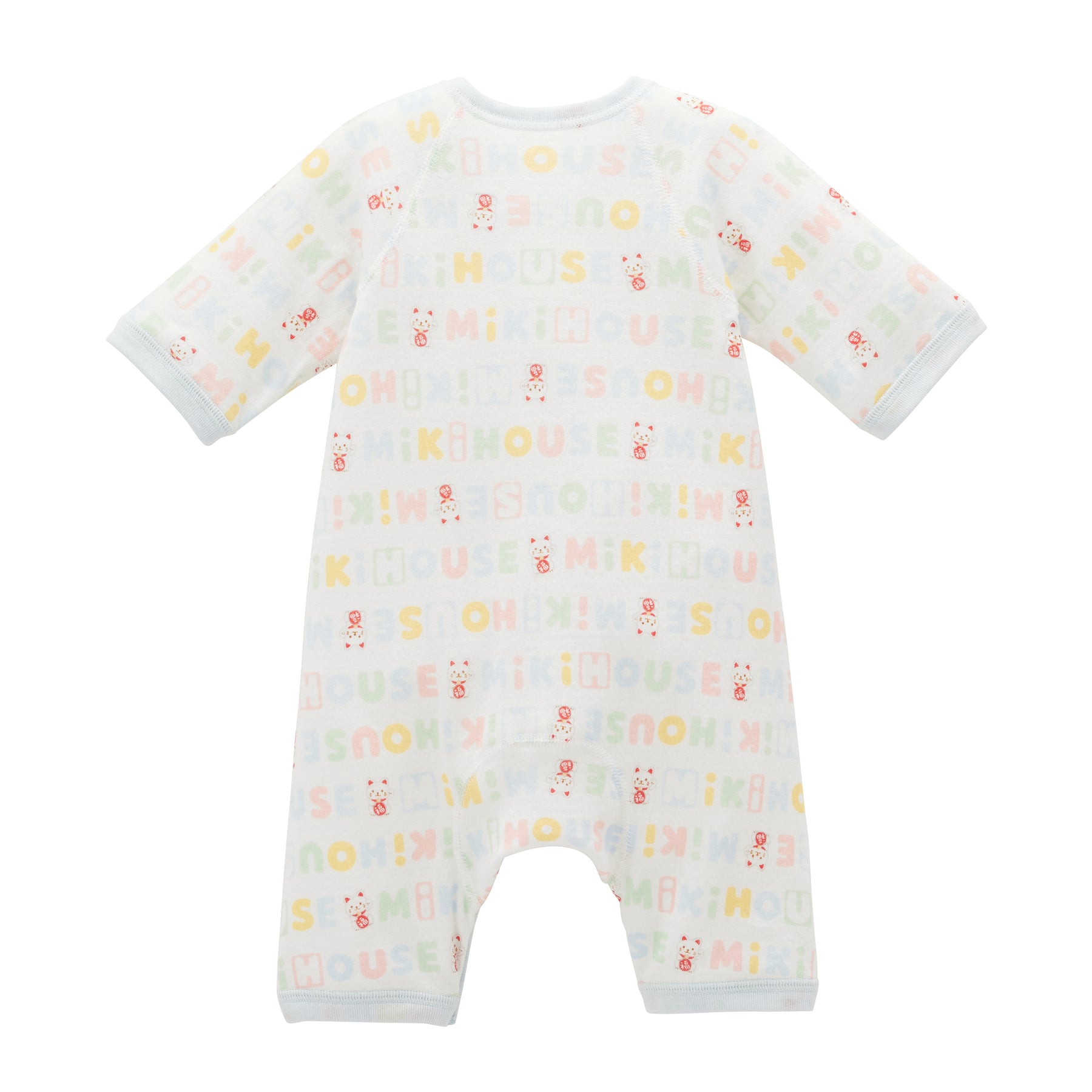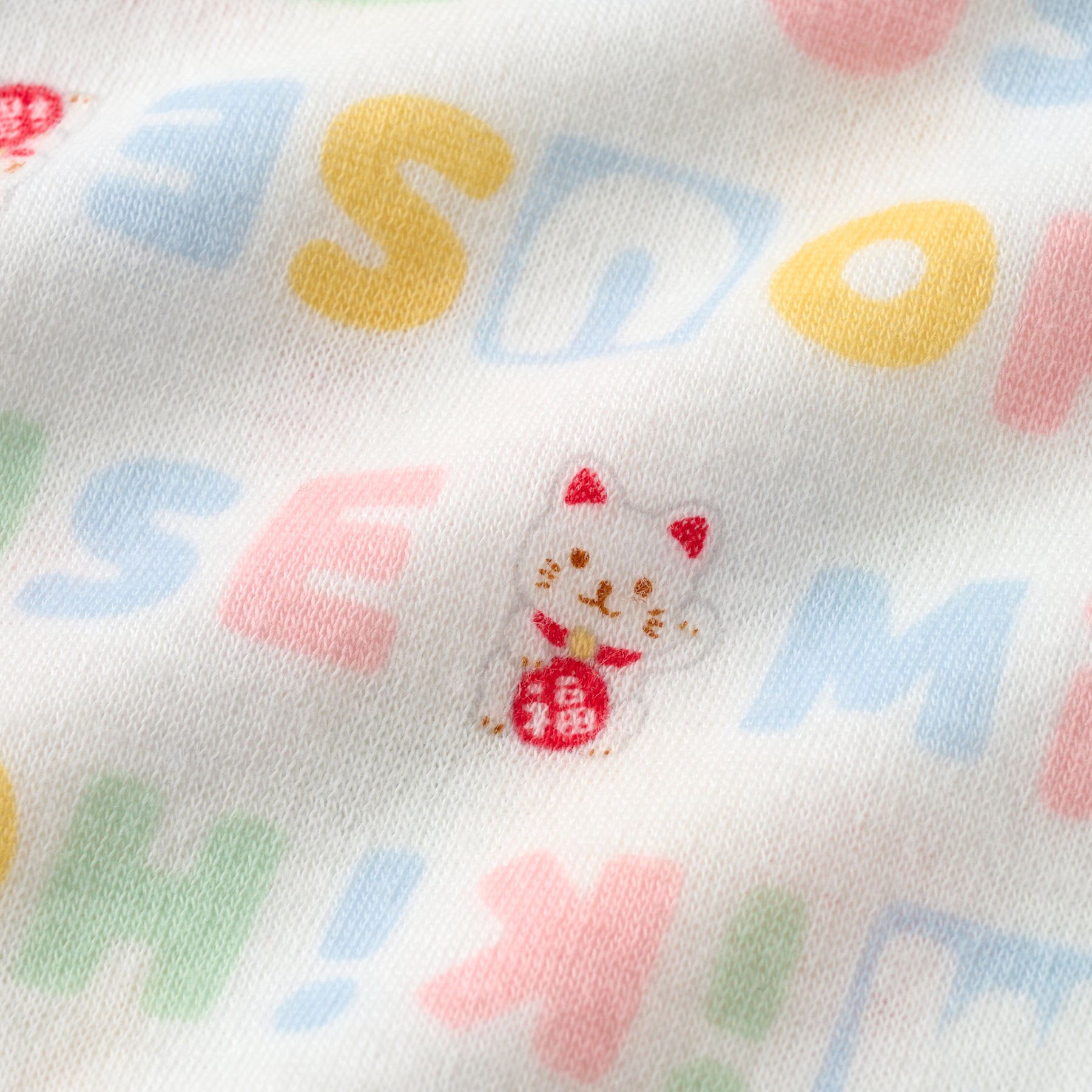 This is a combination all-in-one made of a softly layered double-knit gauze material. It features a print of beckoning cats and lucky daruma dolls. These auspicious, very Japanese-style motifs make it a great choice for birth celebrations and gifts.