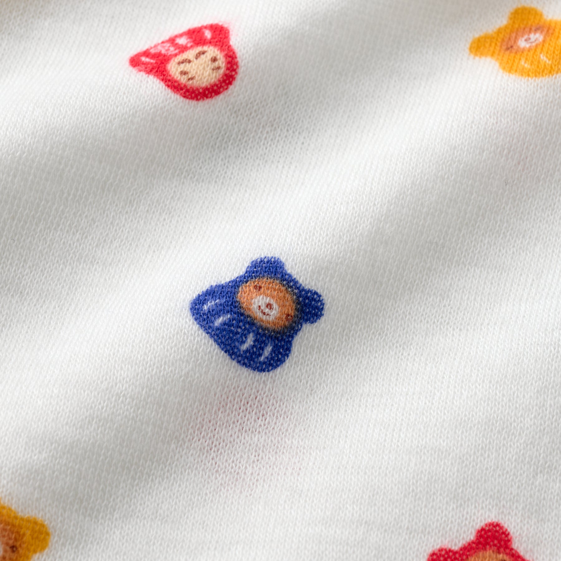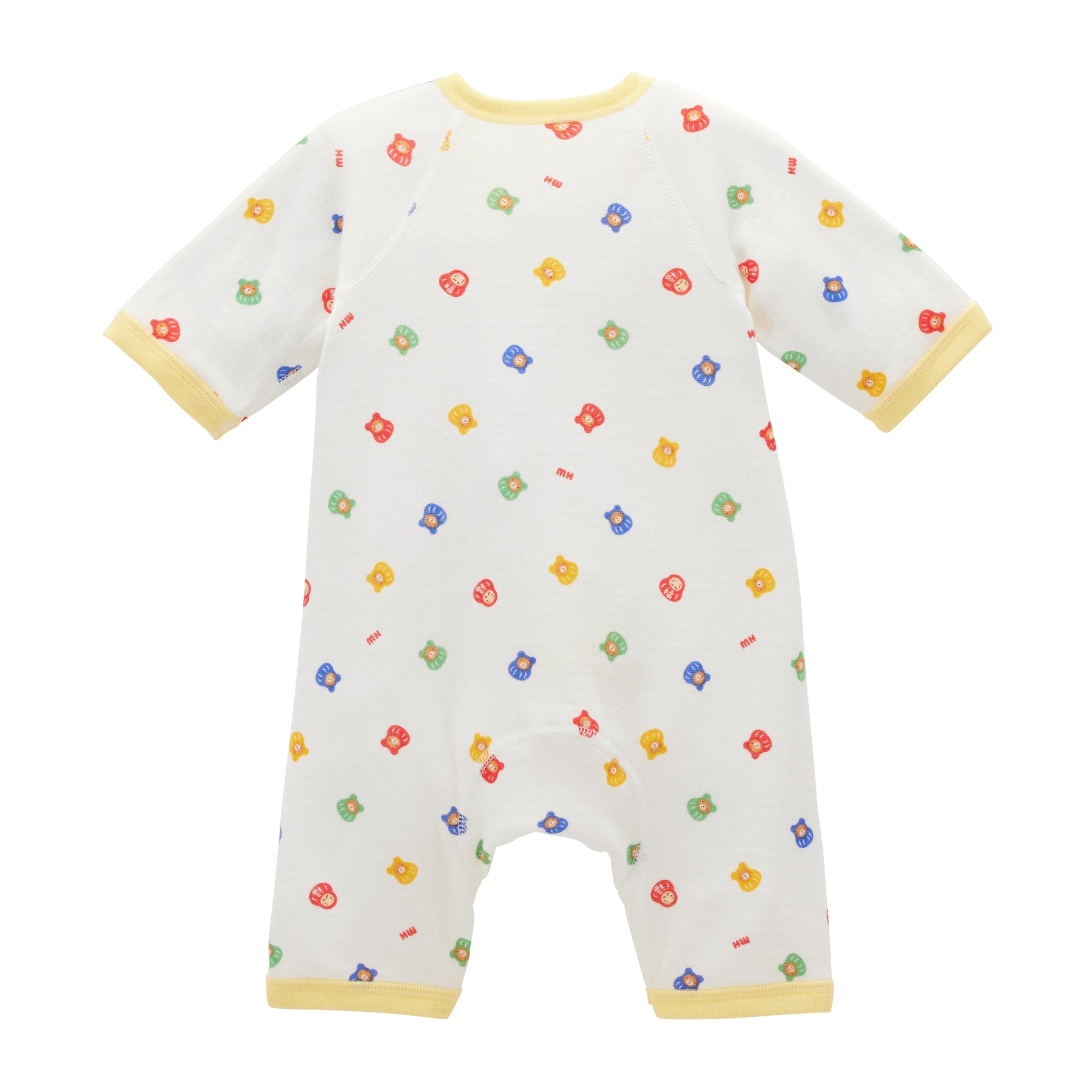 This is a combination all-in-one made of a softly layered double-knit gauze material. It features a print of beckoning cats and lucky daruma dolls. These auspicious, very Japanese-style motifs make it a great choice for birth celebrations and gifts.