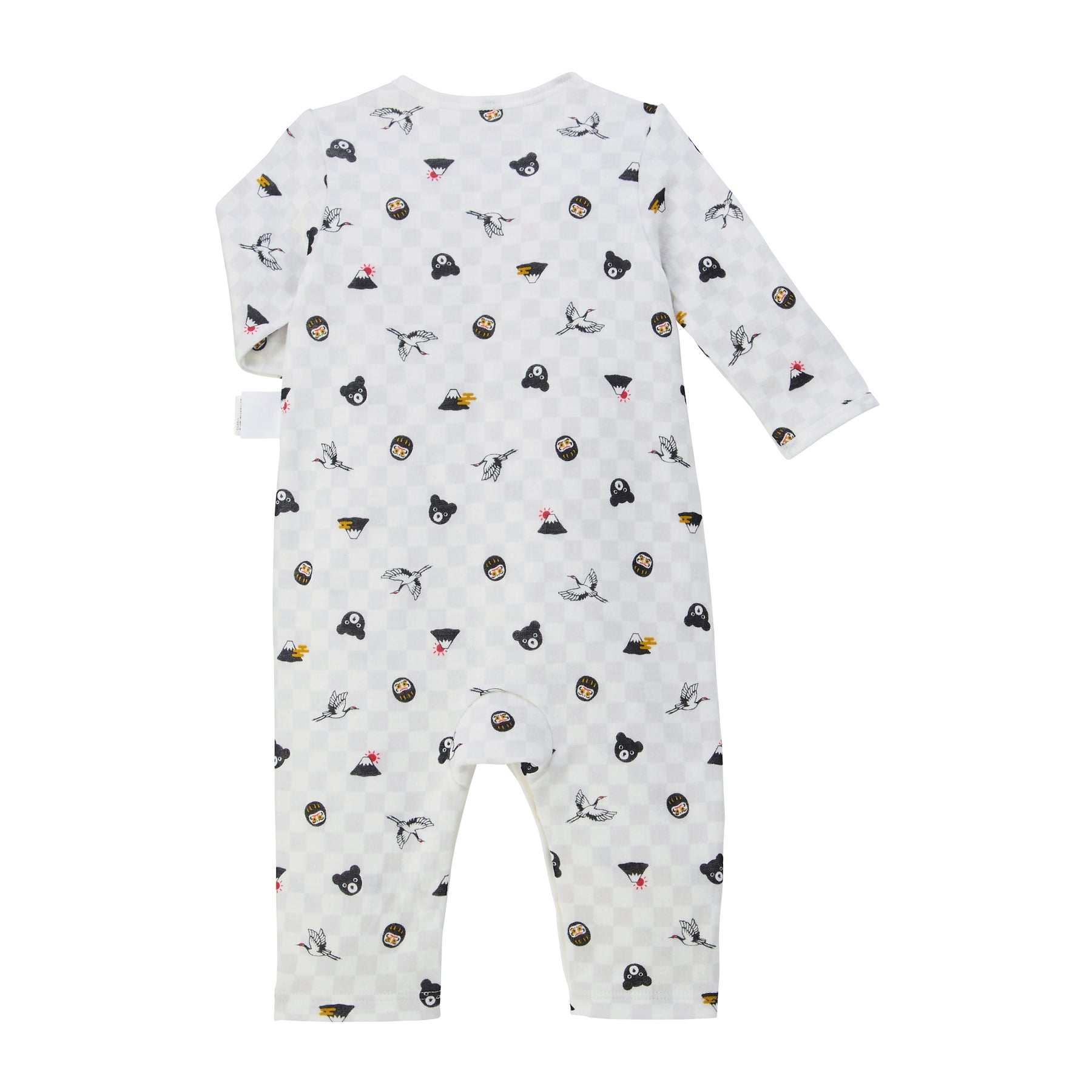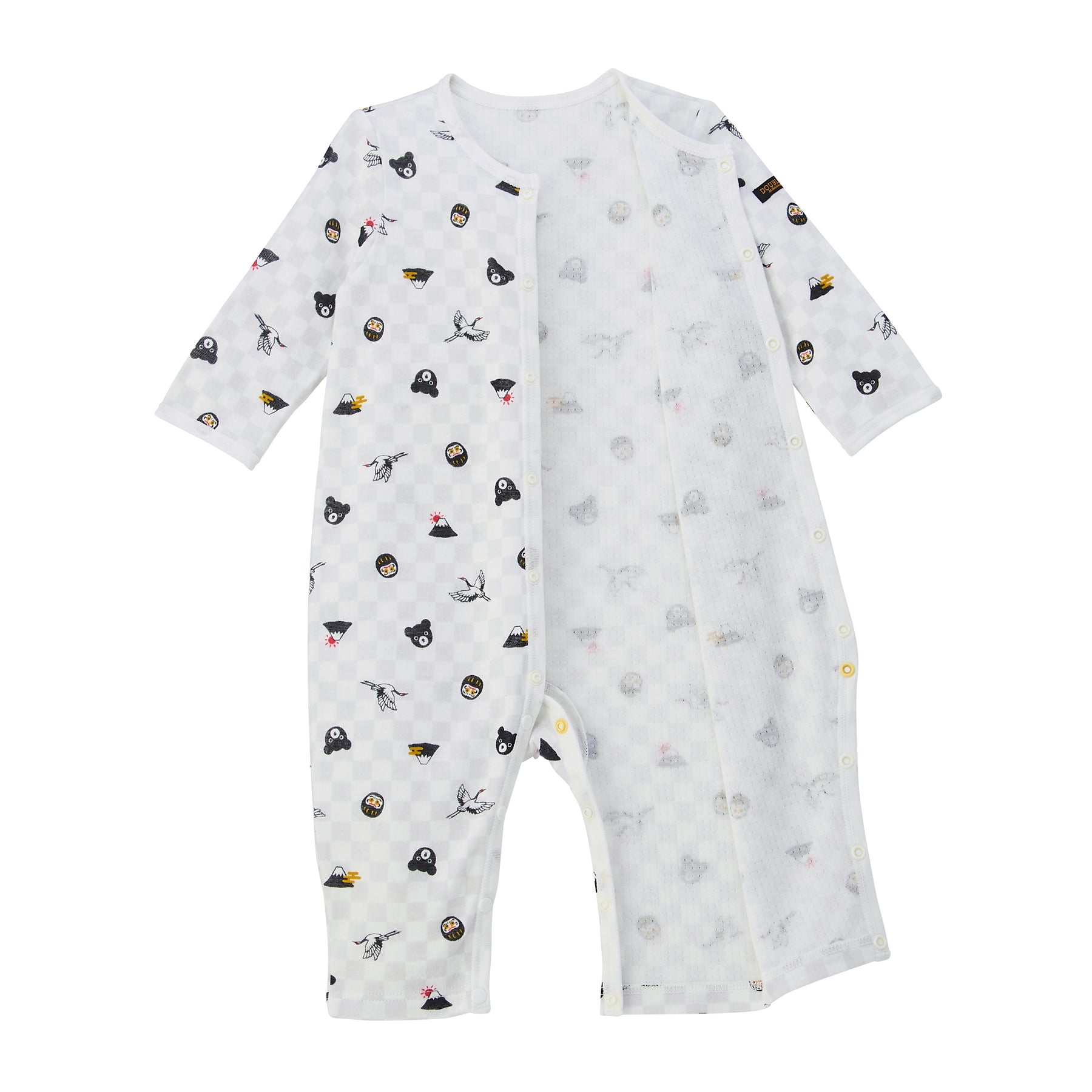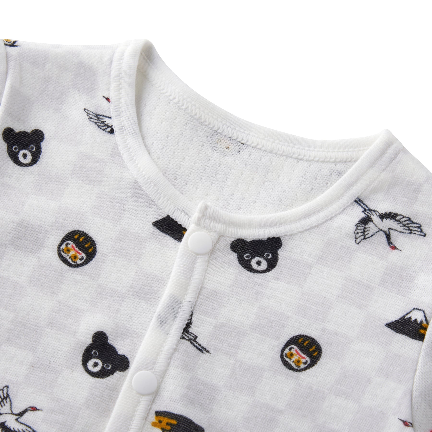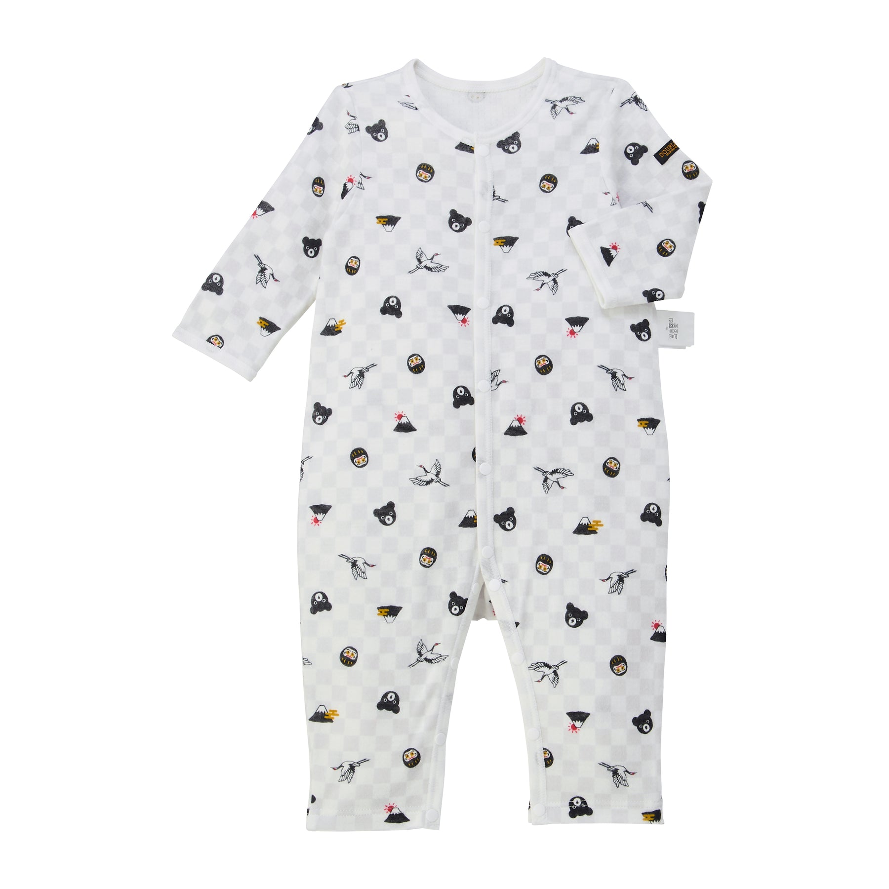 This coverall underwear is made of a softly layered double-knit gauze material. Cranes, daruma dolls, and a checkered pattern of Mt. Fuji, along with an original all-over print of black bears. Available in sizes up to 90 cm to accommodate larger sizes.