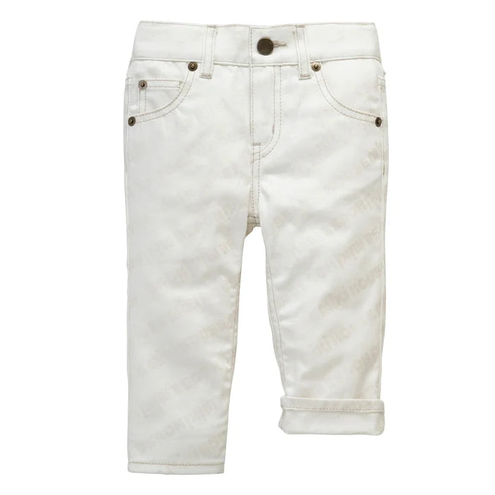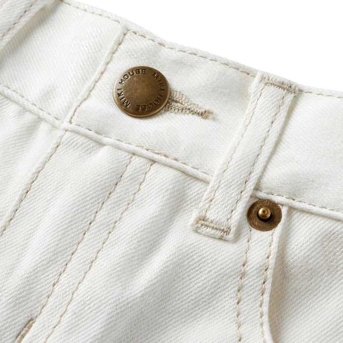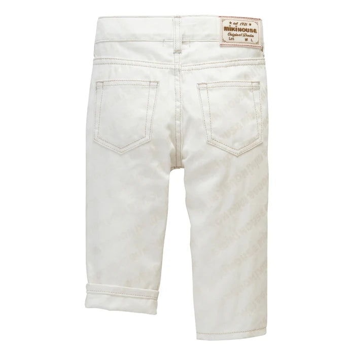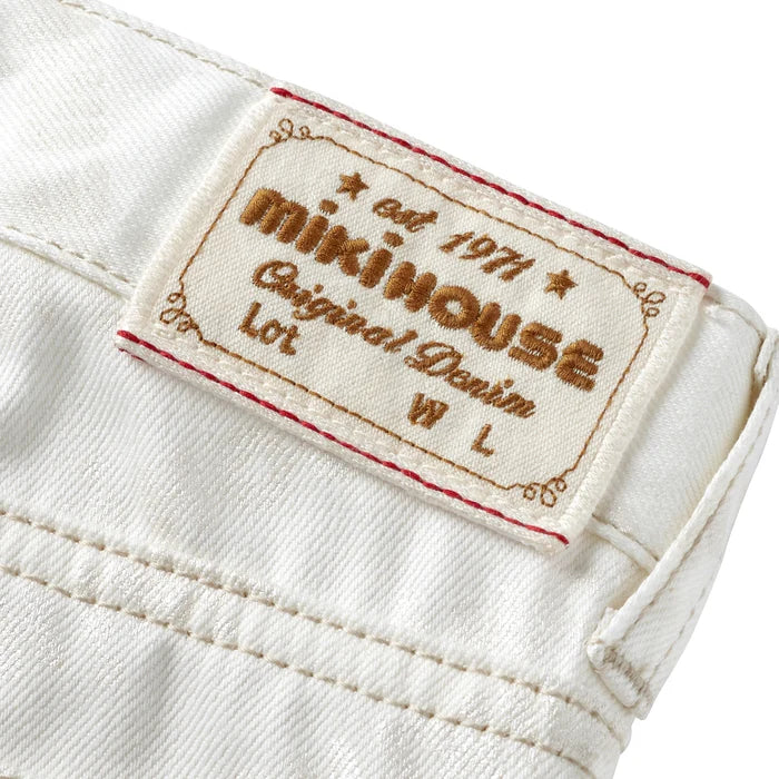The denim fabric printed with the Miki House logo is very distinctive. To achieve softness and a special texture, it has undergone a washing process as well as treatments to reduce twisting and shrinkage.