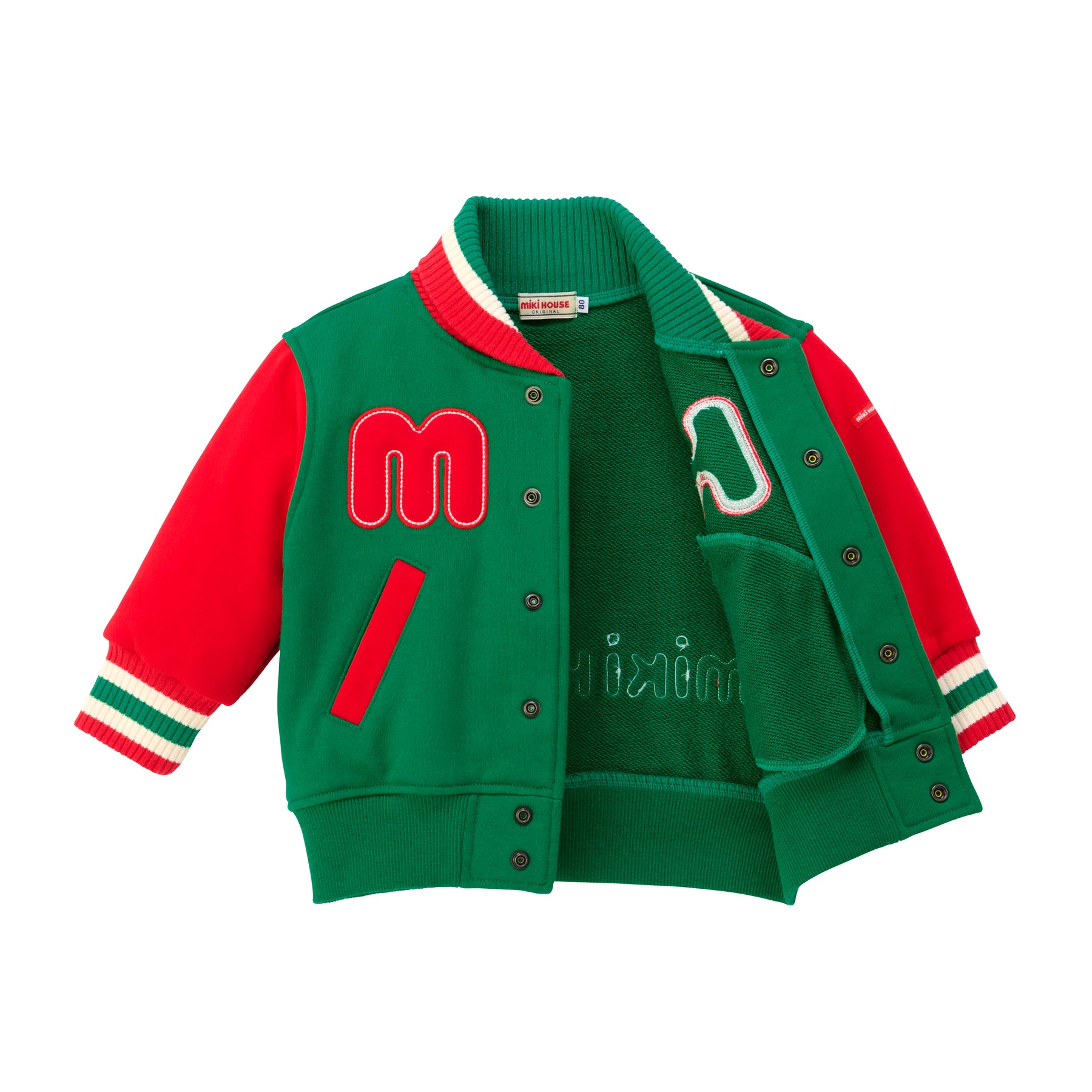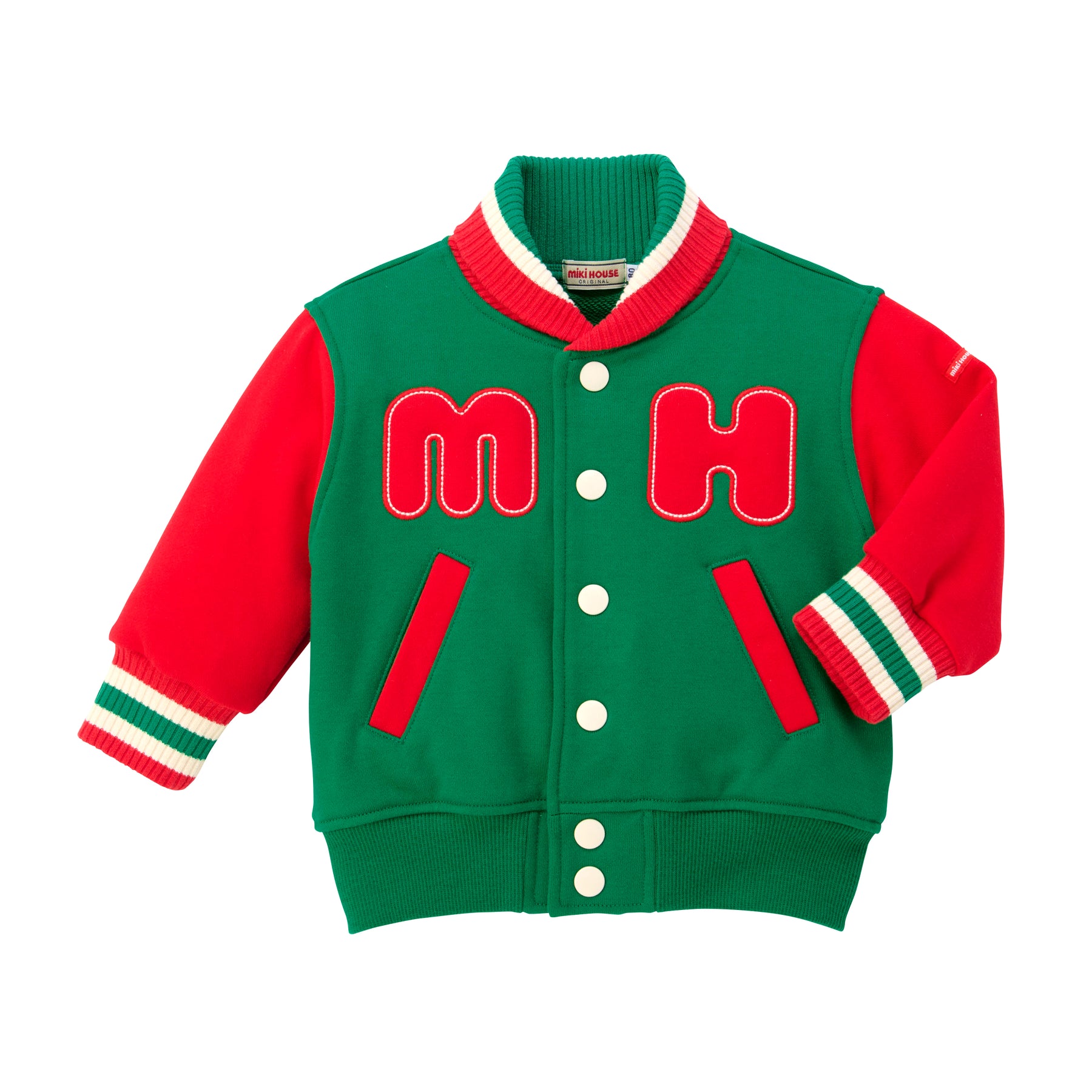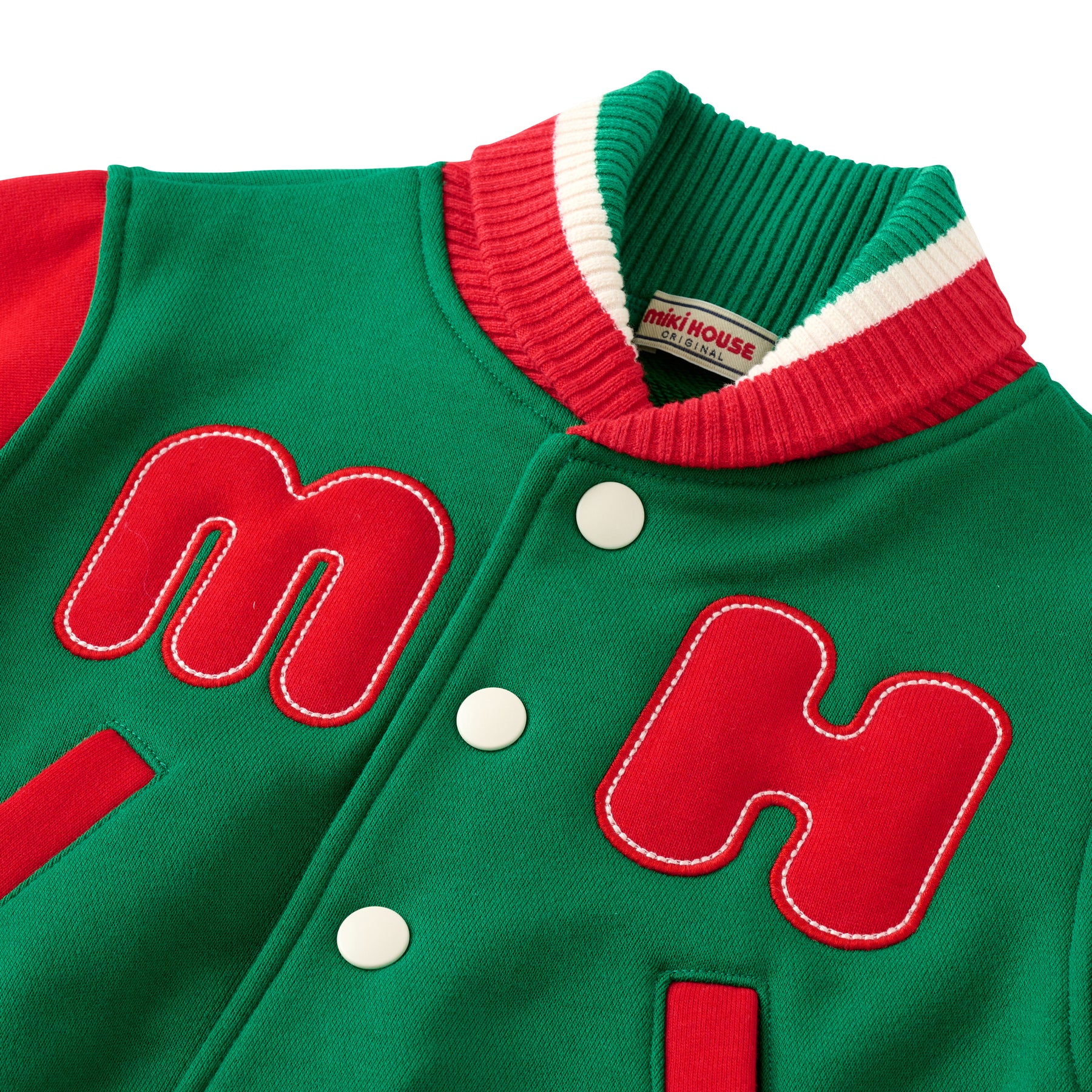 This jacket has a striking MH logo on the chest, styled like a varsity jacket.