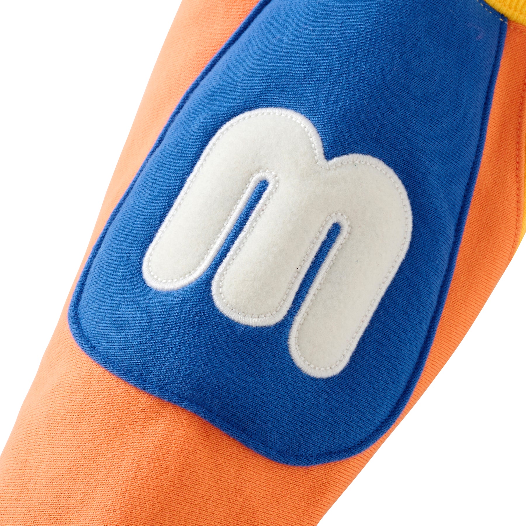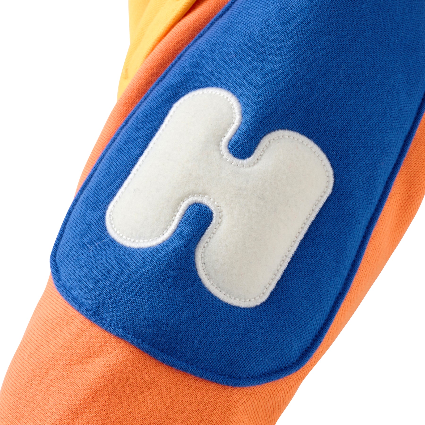 This sweatshirt stands out with a large "M·H" patch on the shoulder.