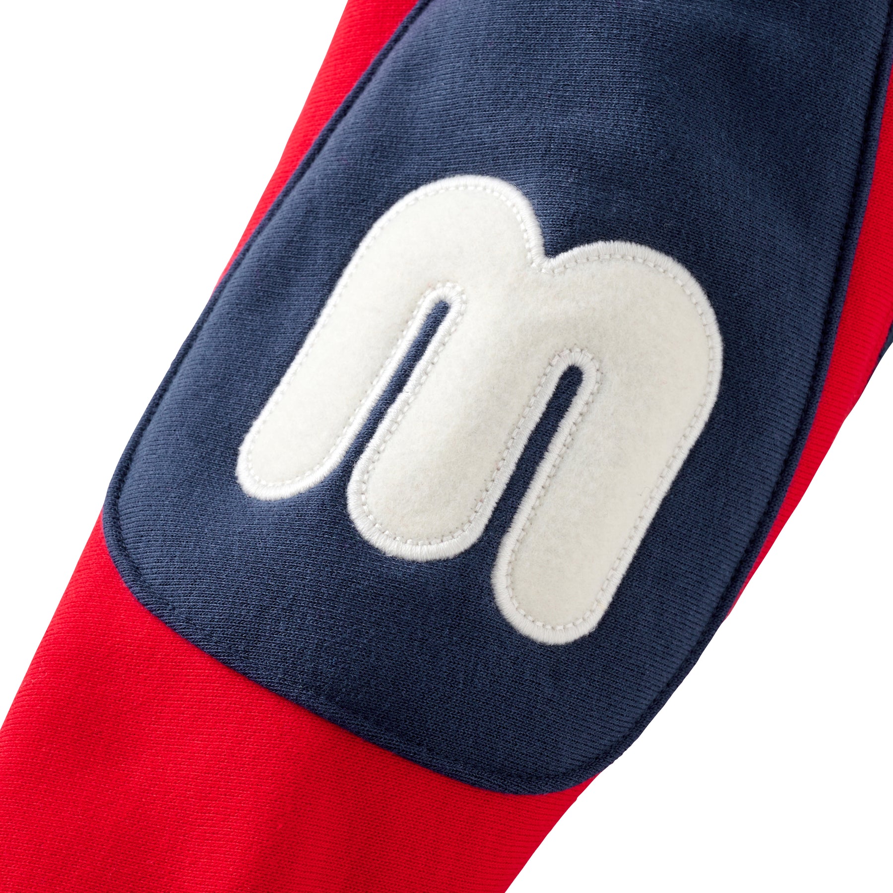 This sweatshirt stands out with a large "M·H" patch on the shoulder.