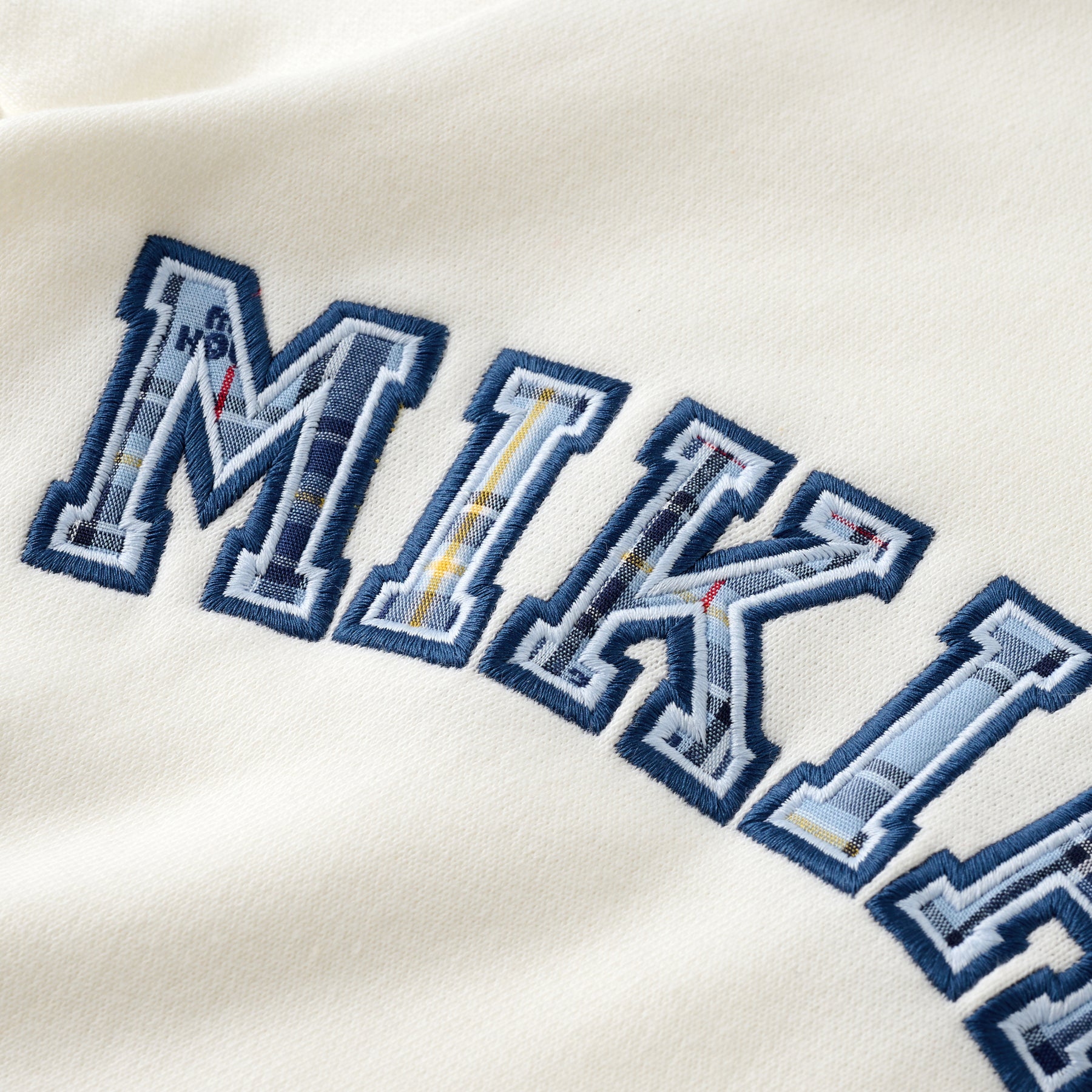 Featuring a font reminiscent of university sweaters combined with Mikihouse check pattern, it offers a stylish yet casual look.